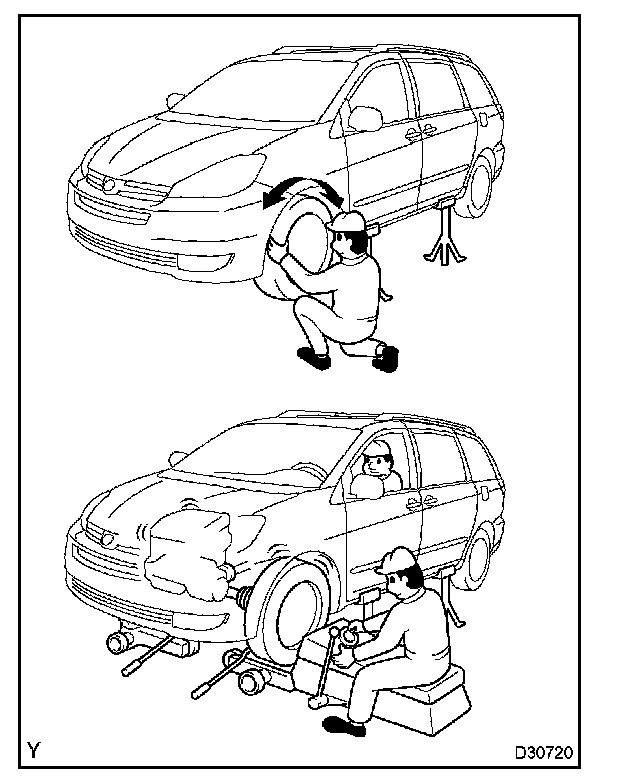 When doing on-vehicle wheel balancing on a full-time 4WD vehicle, to prevent the wheels from rotating at different speeds in different directions from each other (which could damage the center differential), always be sure to observe the following precautions: