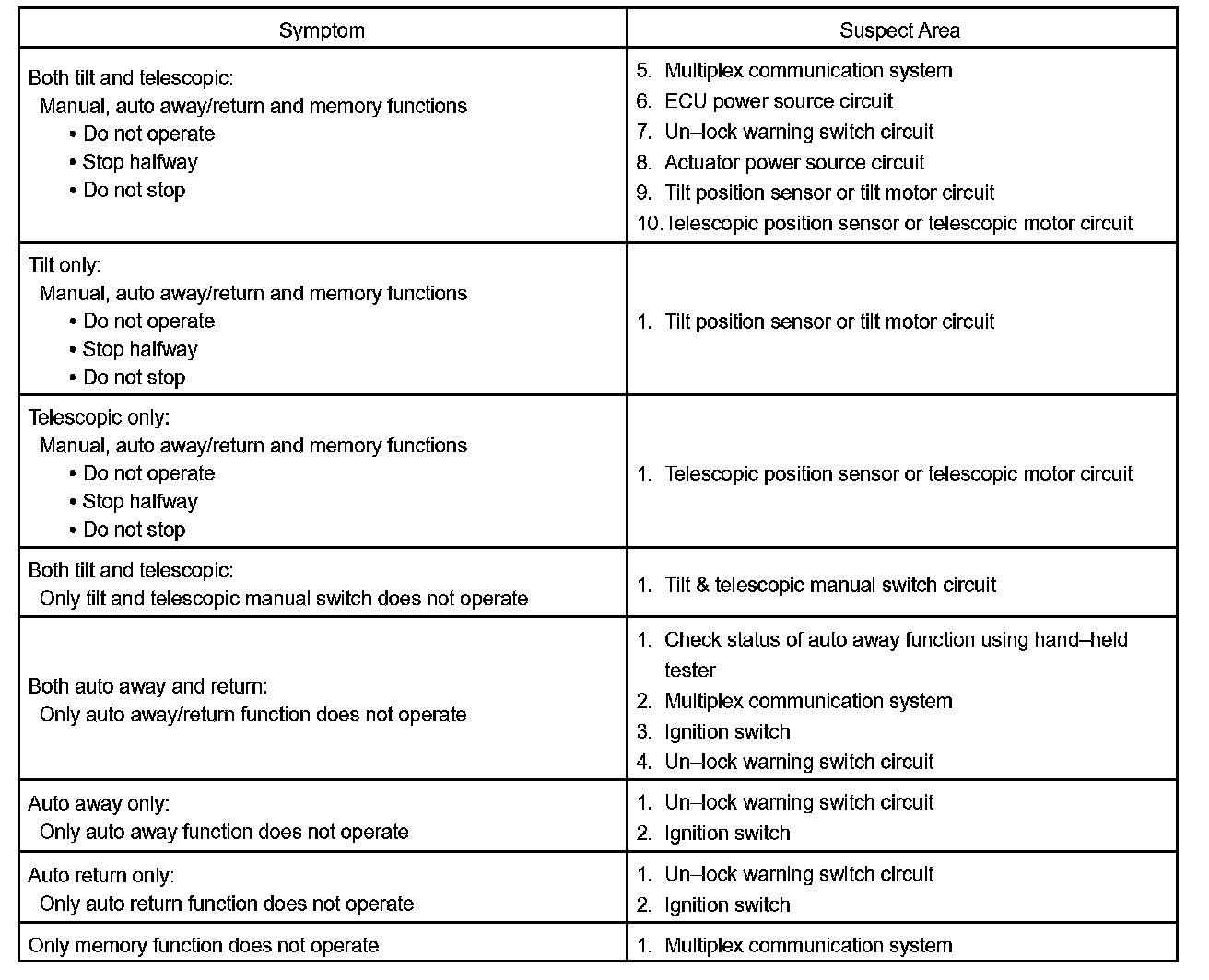 - If the problem still occurs even though there is no abnormality in the related circuits, check and replace the multiplex tilt & telescopic ECU.