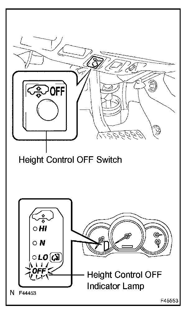 - When the height control OFF switch is operated to prohibit controling the vehicles height, the height control OFF indicator lamp on the combination meter comes on.