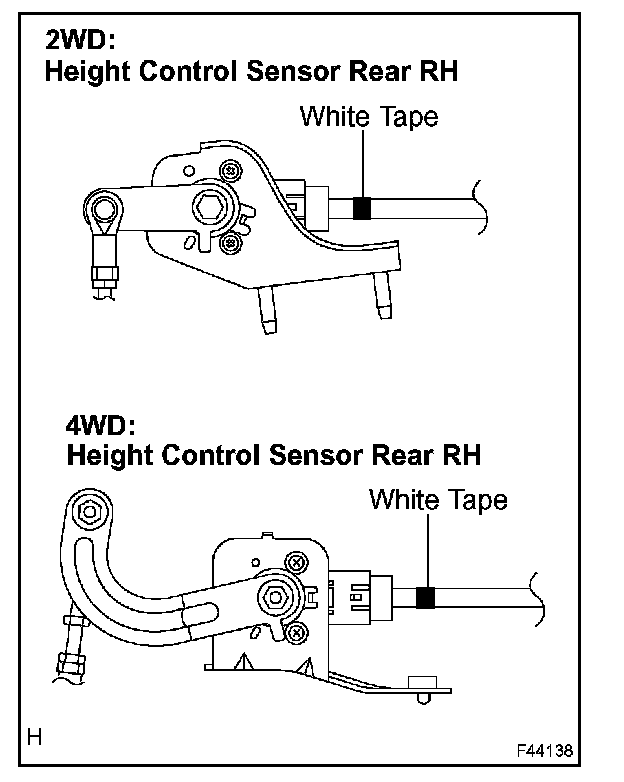 1. In the case where disconnecting the connectors for height control sensor rear RH and height control valve sub-assy No.2, it possible causes incorrect connection. Since these 2 connectors have the same shape, they may be connected incorrectly unless the clamp of wire harness is properly connected. When you connecting the connectors, confirm a mark (white tape) on the wire harness of height control sensor rear RH and the clamp position of wire harness.