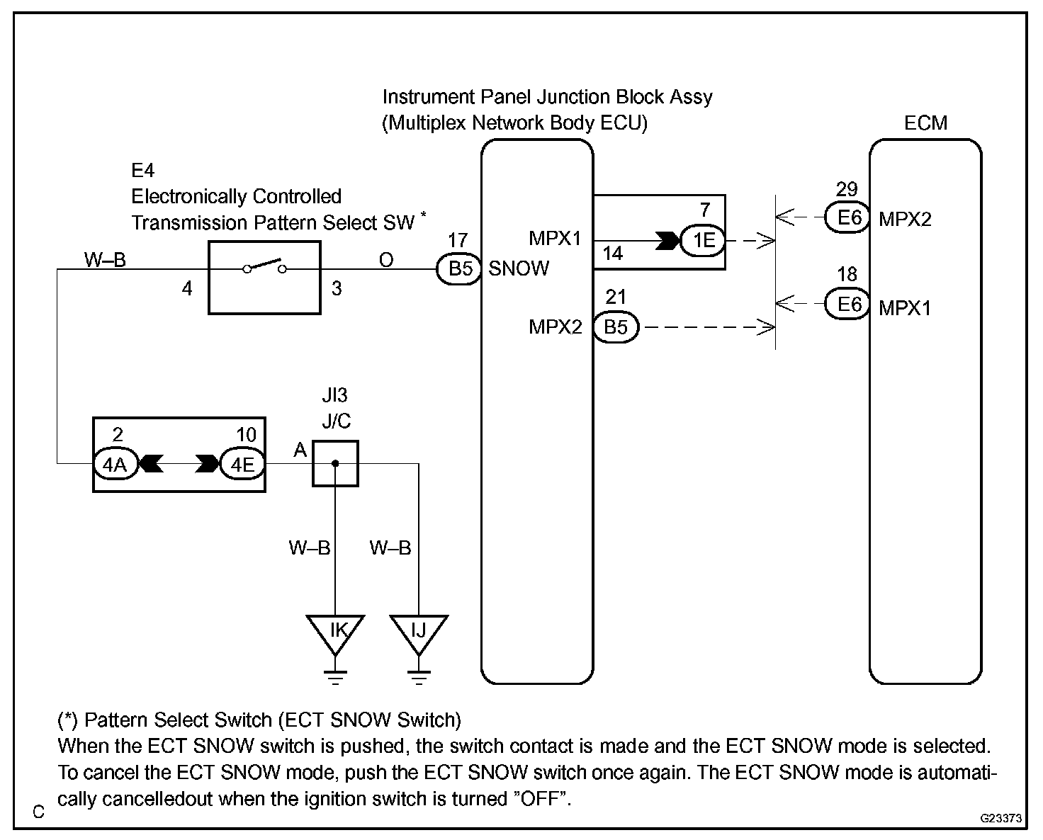 ECT SNOW is the system that operates the throttle motor to control engine output to reduce skidding of the driving wheels, guarantee takeoff acceleration, driving straightness and turning stability.