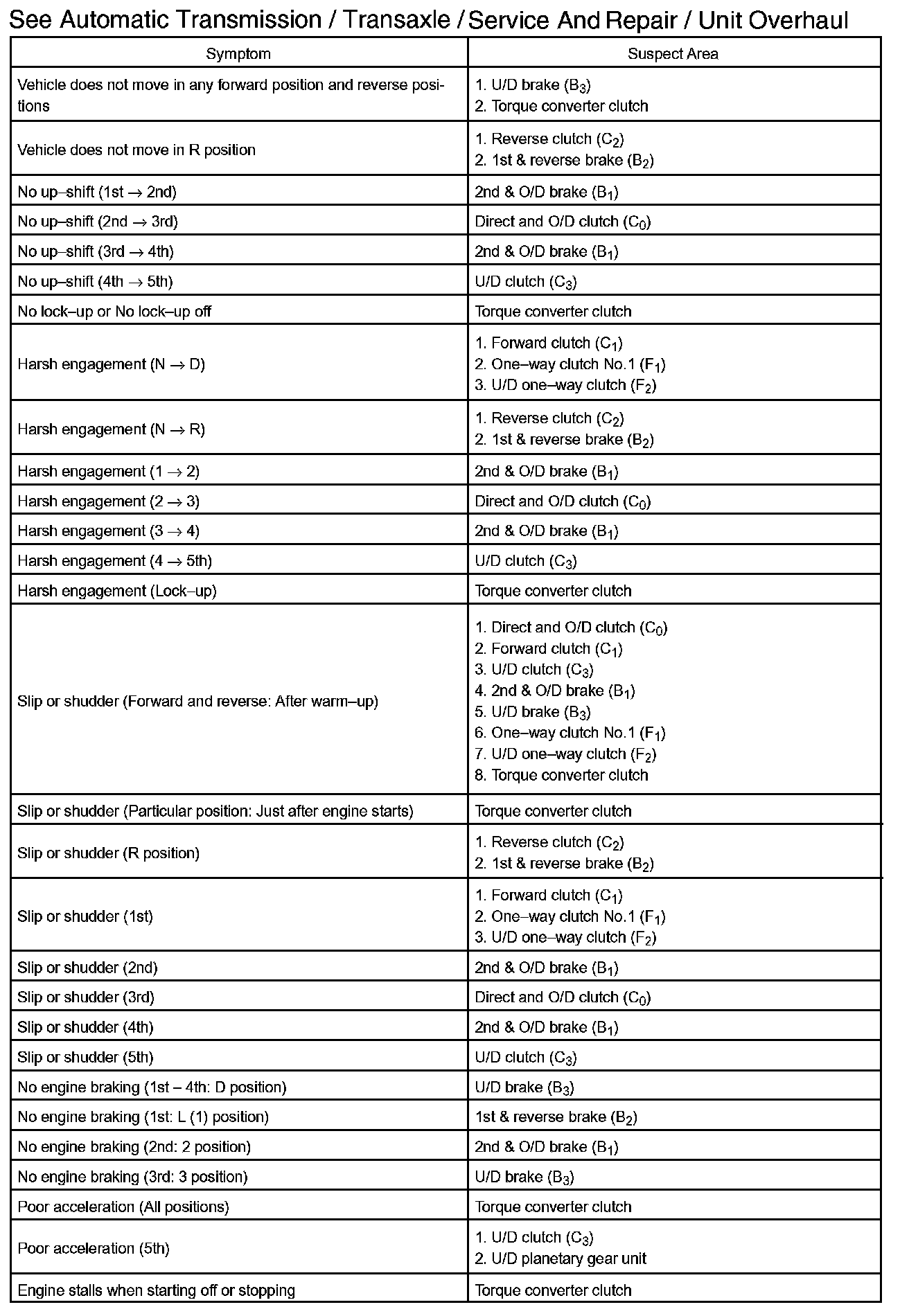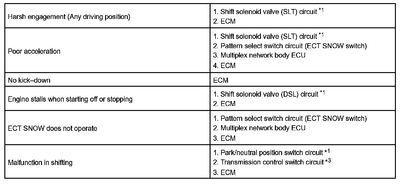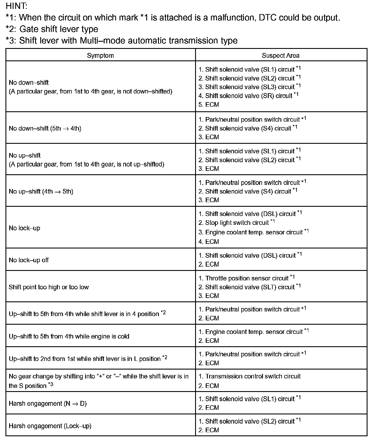 PROBLEM SYMPTOMS TABLEHINT: If a normal code is displayed during the diagnostic trouble code check although the trouble still occurs, check the electrical circuits for each symptom in the order given in the charts and proceed to the appropriate troubleshooting.
