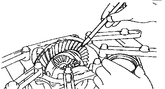 a. After adjusting the backlash of the differential ring gear, remove the teeth side thrust shim.