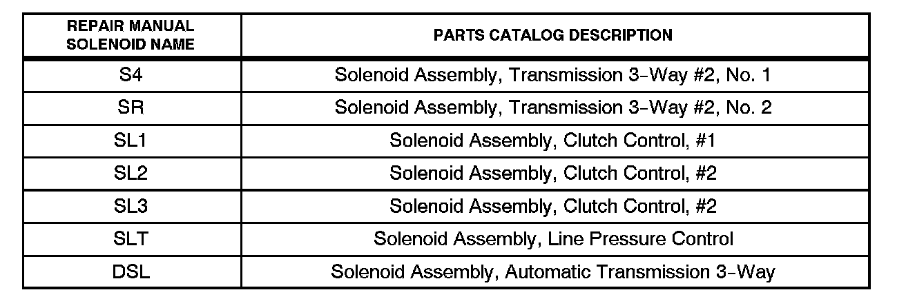 Provided is a chart listing the repair manual name of each solenoid used in the U150E/U151E/U151F transmission as well as the part name description provided in the electronic parts catalog.