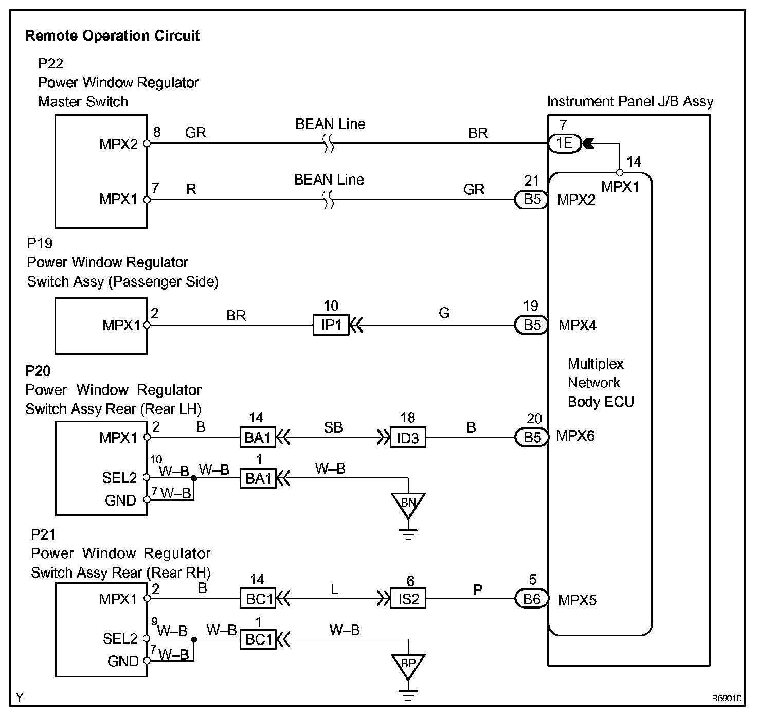 The power window master switch transmits a remote signal (using the BEAN line) to the multiplex network body ECU, which then transmits this remote signal (using the BEAN line) to the passenger side, rear-left and rear-right power window regulator switches respectively. Then, these power window regulator switches drive the applicable window motors.