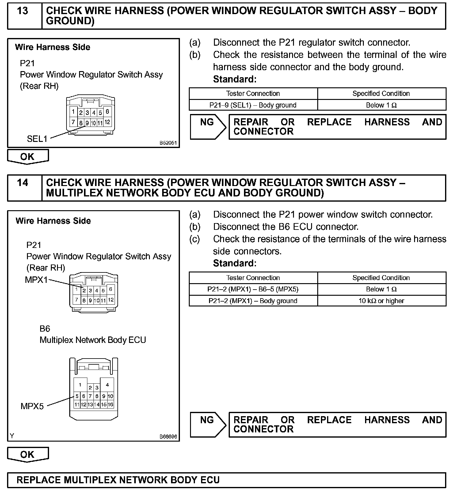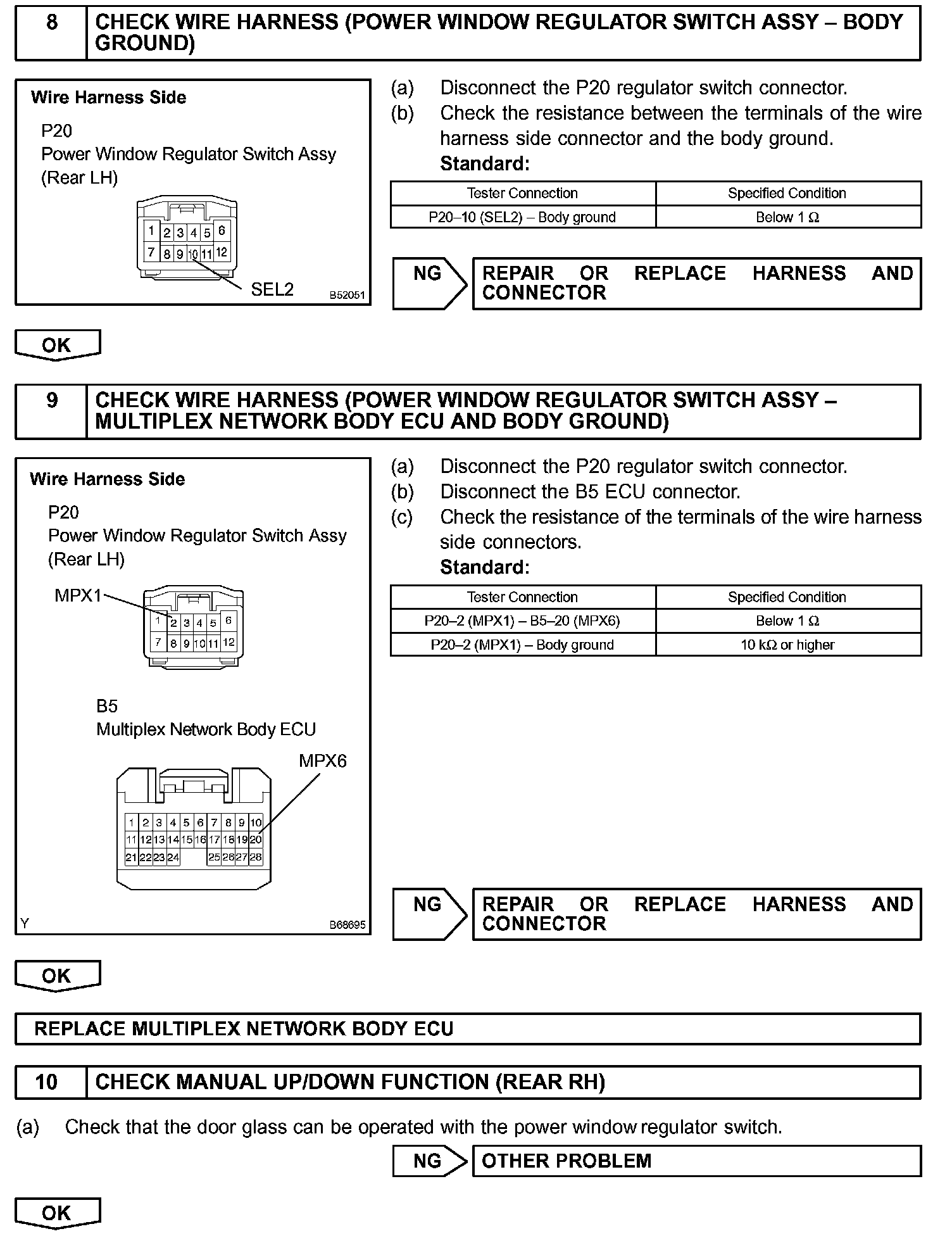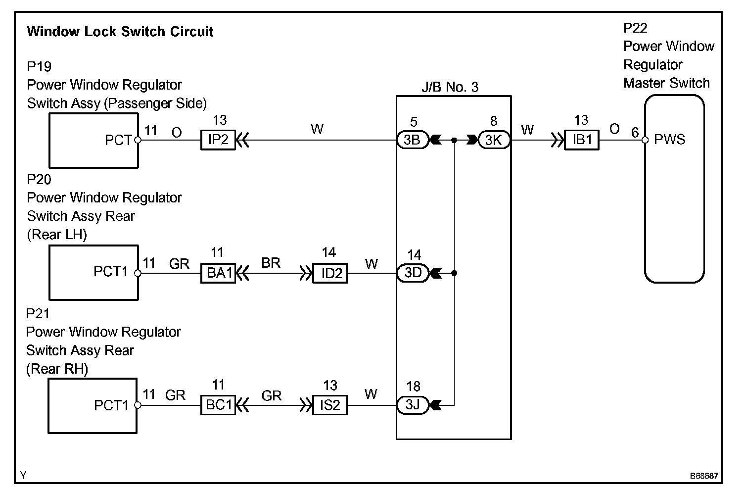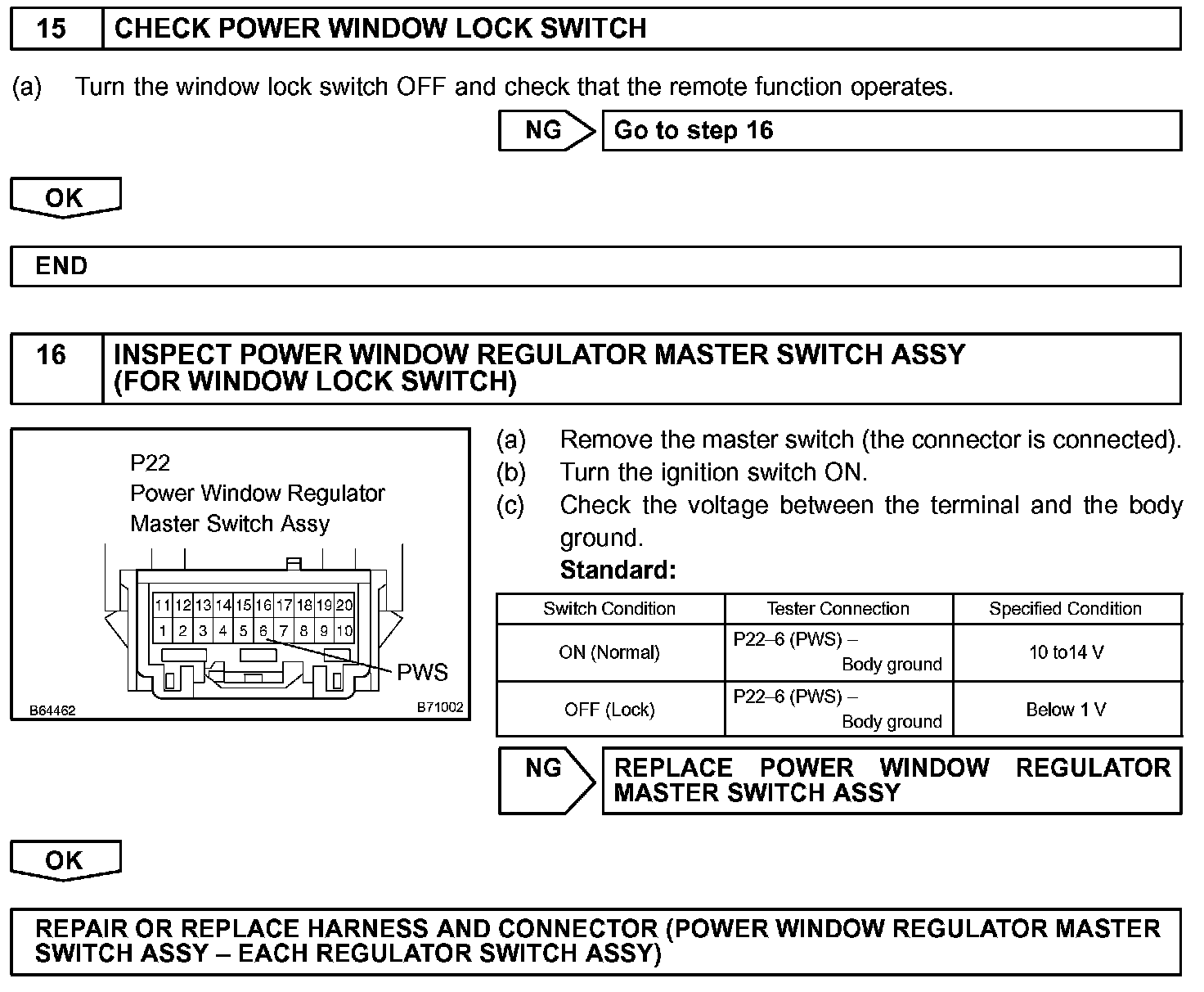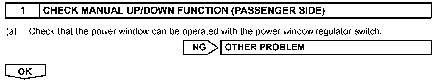 HINT: Check which power window cannot be operated, and then proceed with troubleshooting procedures for the applicable power window as shown in the table.