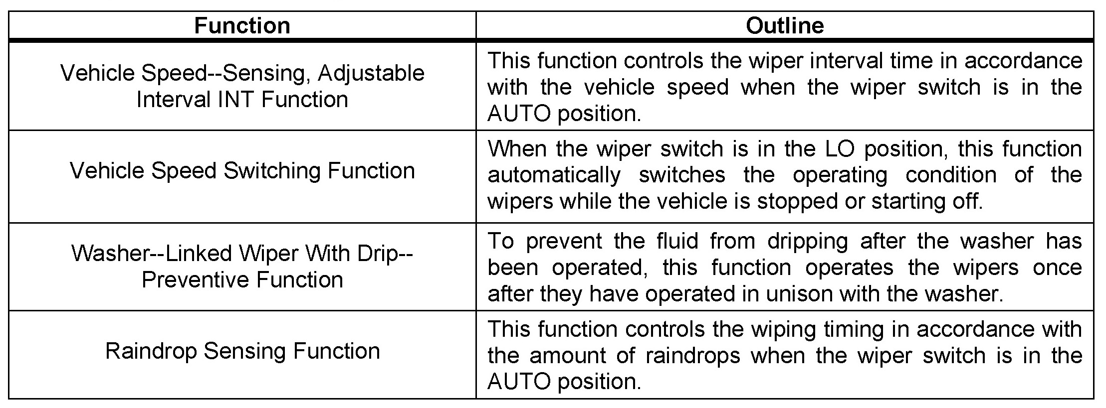 With this function, when the wiper switch is in the OFF or AUTO position, turning the washer switch ON for approximately 0.2 seconds or longer causes the washers to operate, and after the washer switch has been turned OFF, the wipers operate in unison 3 times at the low speed. Approximately 3 seconds (when the vehicle speed is between 0 to 36 mph [0 to 59 km/h]) after the low-speed operation of the wipers has been completed, the wipers operate once again to wipe off the washer fluid that has dripped. The drip prevention interval times are shown in the table according to the vehicle speed.