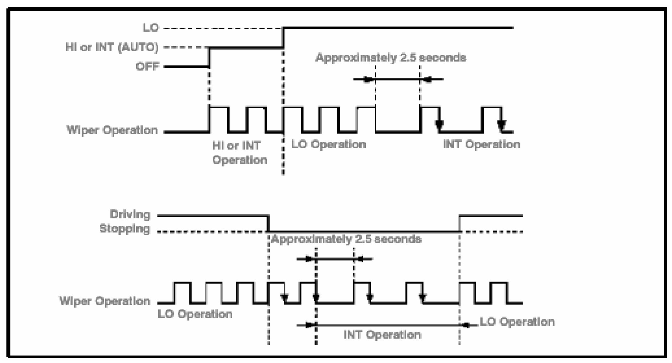 When the vehicle is stopped, moving the wiper switch from the AUTO or HI position to the LO position causes the wipers to operate 3 times at the low speed and then automatically switch to intermittent operation with an interval time of approximately 2.5 seconds. When the vehicle is being driven and the switch is in the LO position, stopping the vehicle causes the wipers to operate twice and then switch to intermittent operation with an interval time of approximately 2.5 seconds.