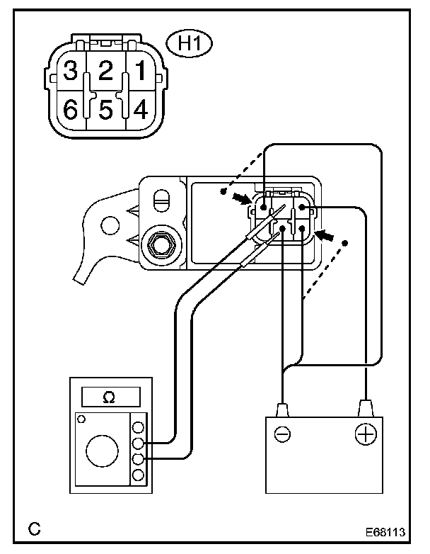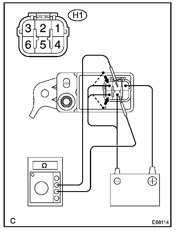 5. Connect the negative (-) lead of the battery to the terminal 3 and the terminal 6, and check that continuity exists between the terminal 2 and the terminal 5 for 0.8 to 0.9 seconds, then no continuity exists.