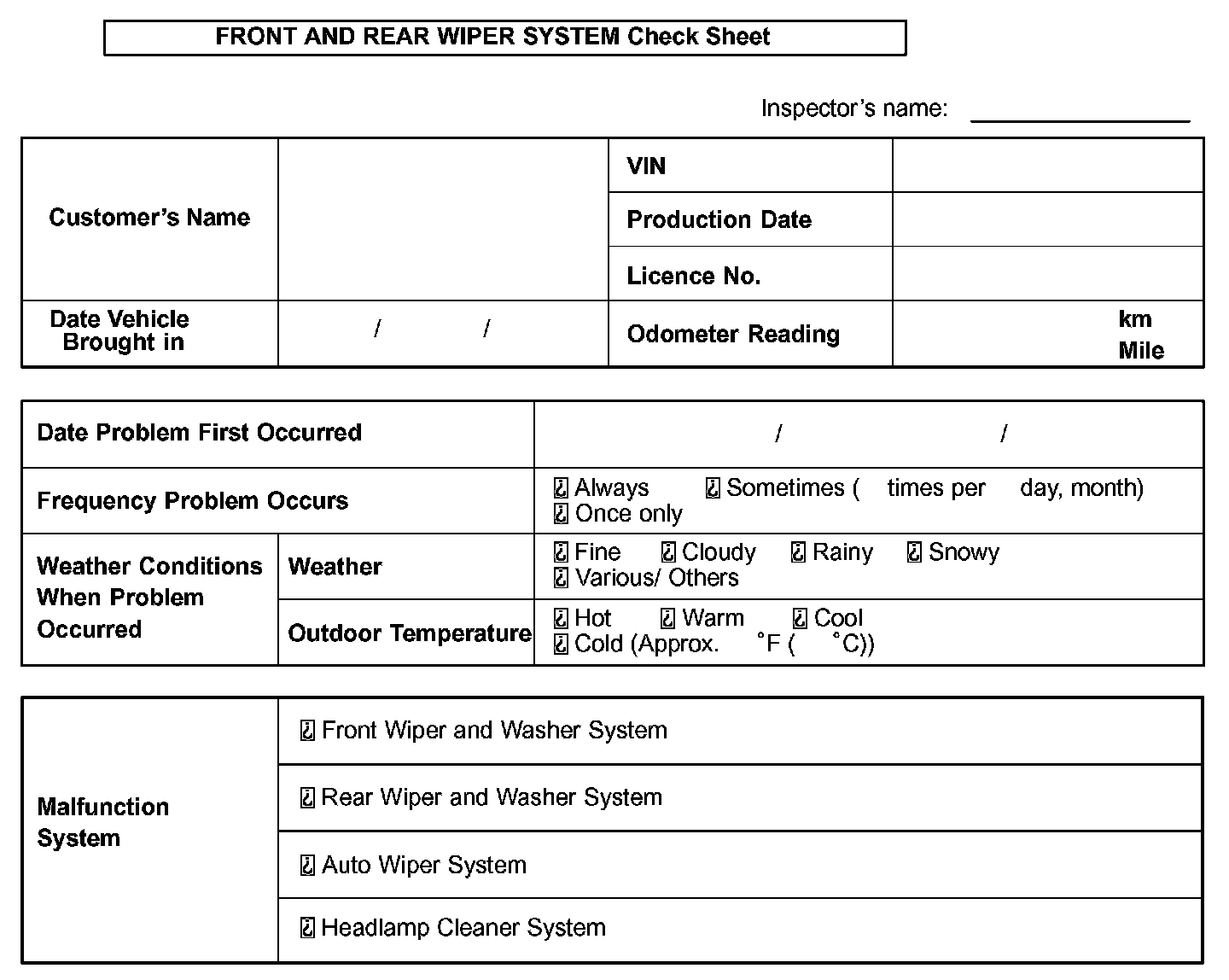 Front And Rear Wiper System Check Sheet: