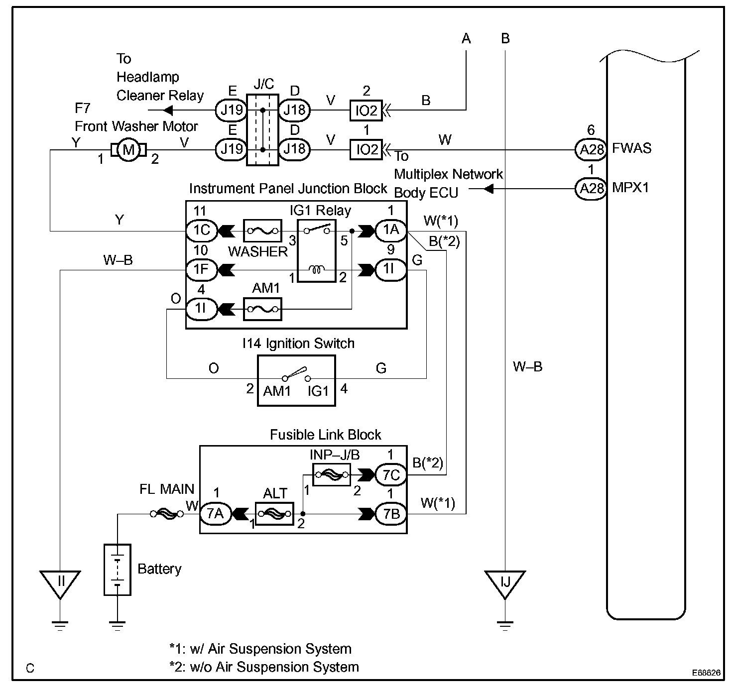 This circuit detects the state of the wiper and washer switch and sends it to the windshield wiper relay assy.