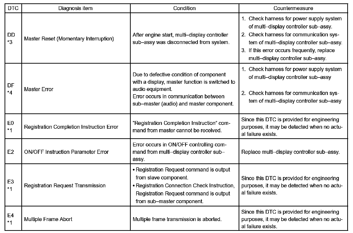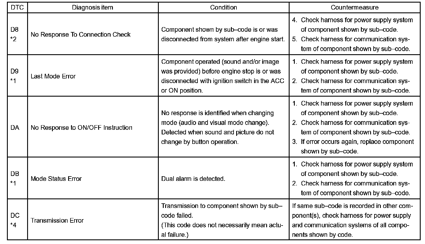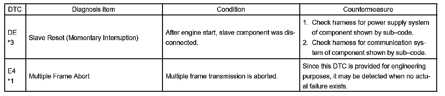 - *4: This code is stored 210 seconds after the power supply connector of the master component is disconnected with the ignition switch in the ACC or ON position.
