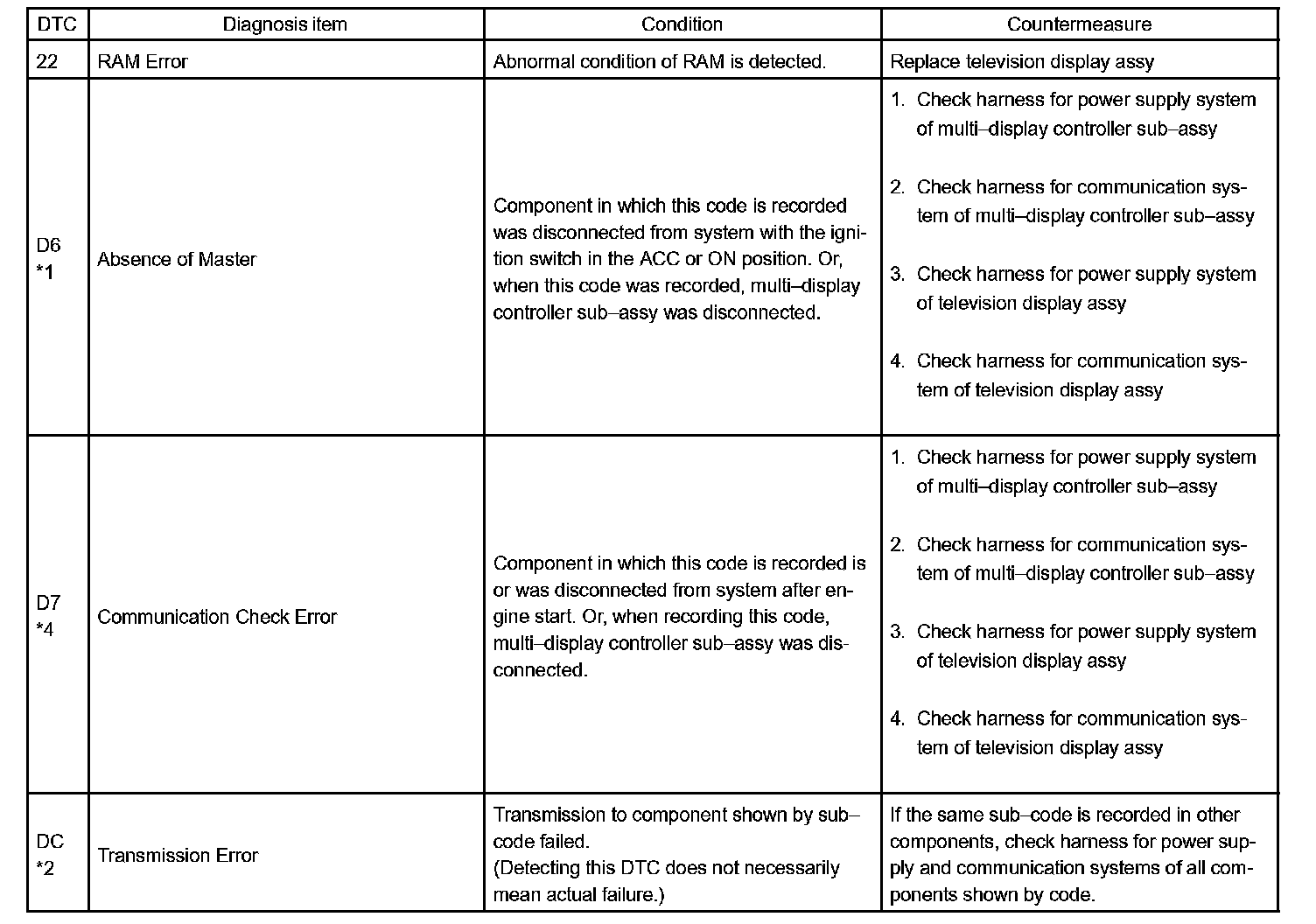 DIAGNOSTIC TROUBLE CODE CHARTHINT: DTCs of the main AVC-LAN circuit are displayed on the radio receiver assy, and DTCs of the sub AVC-LAN circuit is displayed on the multi-display controller sub-assy.