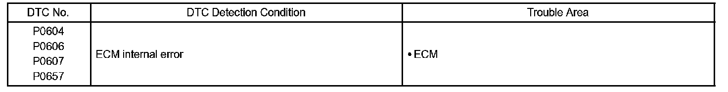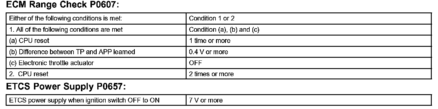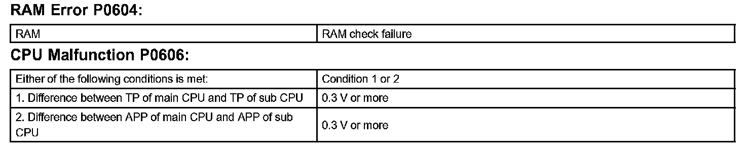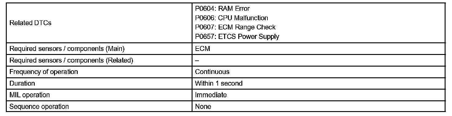 The ECM memory status is diagnosed by internal "mirroring" of the main CPU and the sub CPU to detect Random Access Memory (RAM) errors. The two CPUs also perform continuous mutual monitoring. The ECM sets a DTC if: 1) outputs from the 2 CPUs are different and deviate from the standards, 2) the signals to the throttle actuator deviate from the standards, 3) a malfunction is found in the throttle actuator supply voltage, and 4) any other ECM malfunction is found.