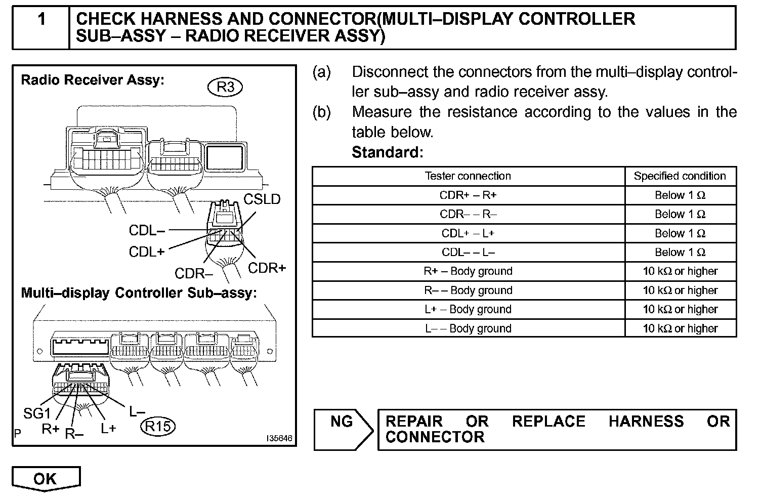 The multi-display controller sub-assy sends a sound signal to the radio receiver assy through this circuit. The sound signal that has been sent is amplified by the stereo component amplifier assy, and then is sent to the speakers.