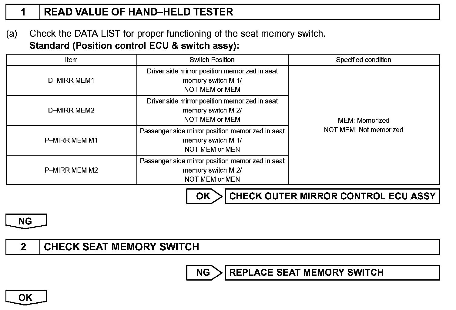 When the seat memory switch M1 or M2 is pressed, the position control ECU & switch (Seat ECU) transmits a signal of the memorized mirror position to the outer mirror control ECU by way of the power window regulator master switch. Then, the outer mirror control ECU drives the mirror motor.