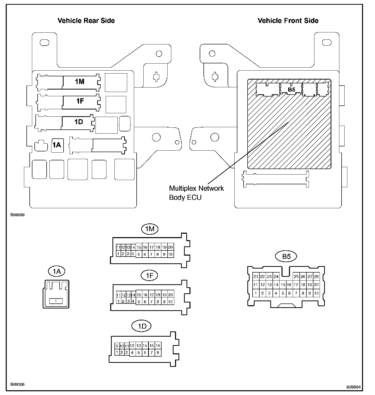 a. Disconnect the 1A, 1D, 1F, 1M and B5 connectors from the instrument panel junction block assembly and multiplex network body ECU.