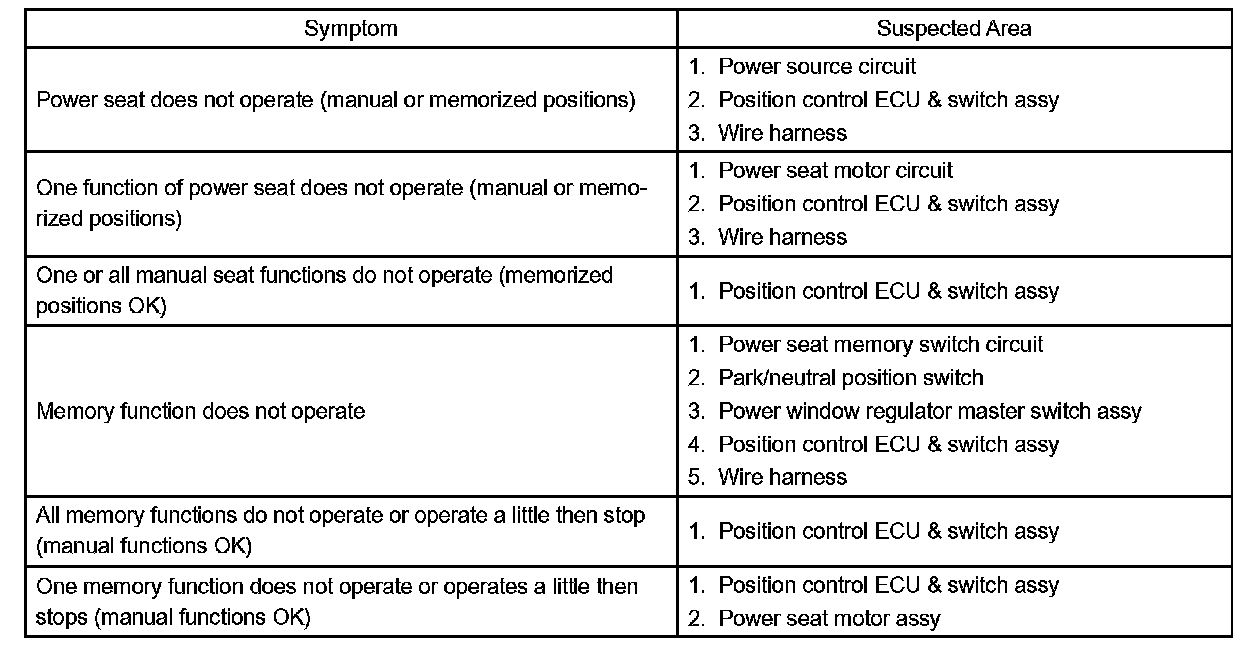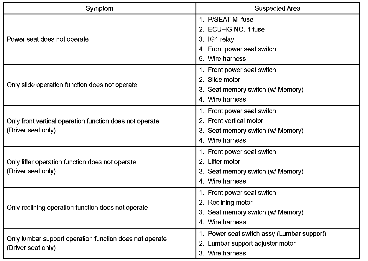 Problem Symptoms Table - Front Power Seat Control System: