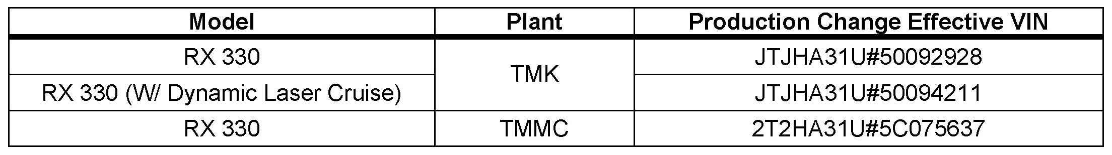 - 2004 - 2005 model year RX 330 vehicles produced BEFORE the Production Change Effective VINs shown below.