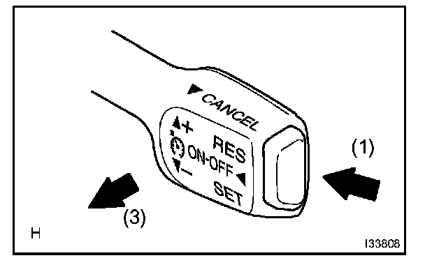 3. Check that the vehicle speed decreases while the control switch is pushed down to -/SET, and the vehicle cruises at the set speed when the switch is released.