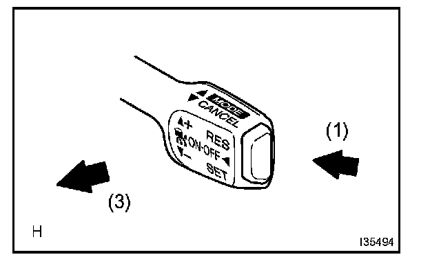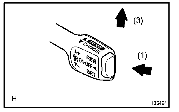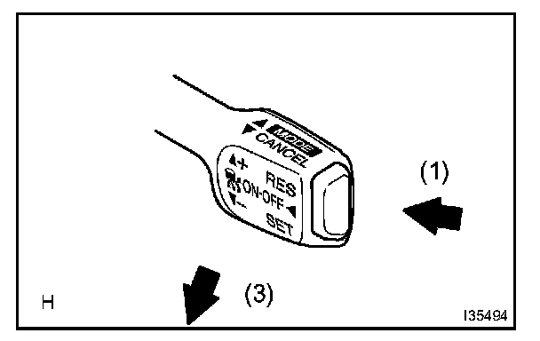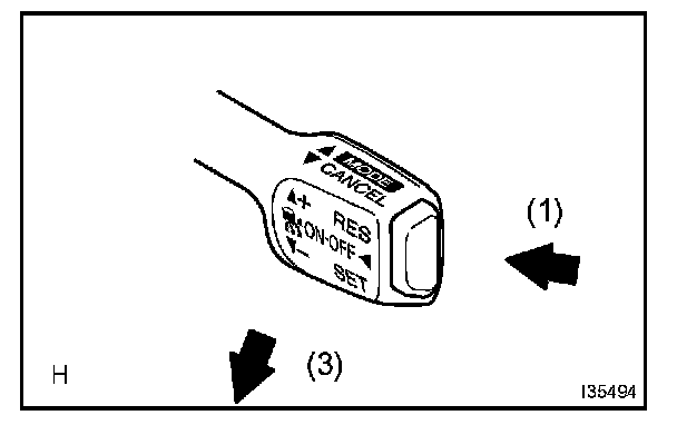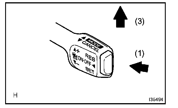 3. Check that the vehicle speed increases while the cruise control main switch is pushed to + /RES, and that the vehicle cruises at the set speed when the switch is released.