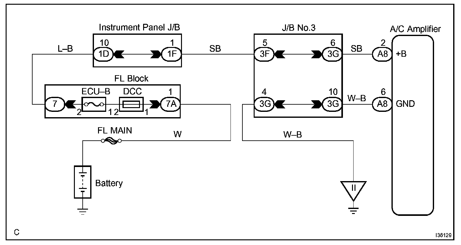 This is the back-up power source circuit for the A/C amplifier. Power is supplied even when turning the ignition switch off and is used for diagnostic trouble code memory etc.