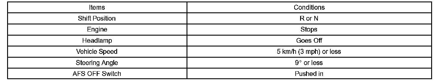 - The AFS continues operation as long as steering angle is kept at 10 or more when operation has started once after steering angle reaches 12 or more.
