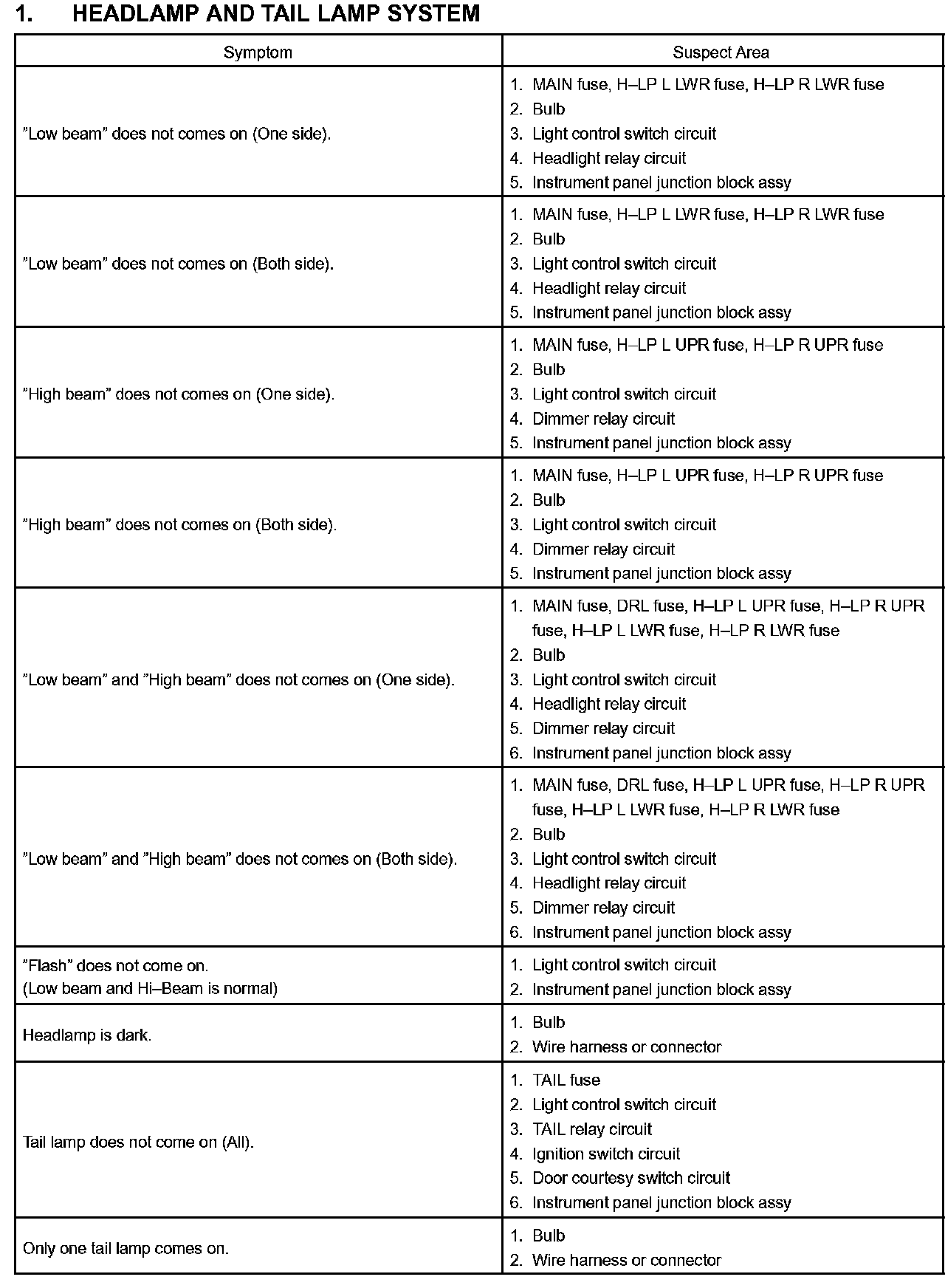 PROBLEM SYMPTOMS TABLEProblem Symptoms Table - Headlamp And Tail Lamp System Part 1: