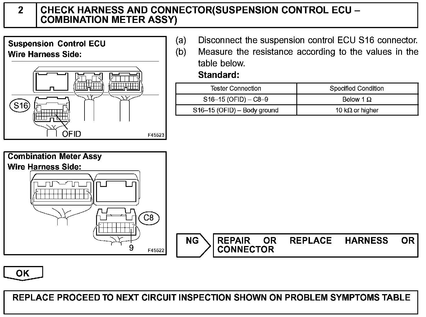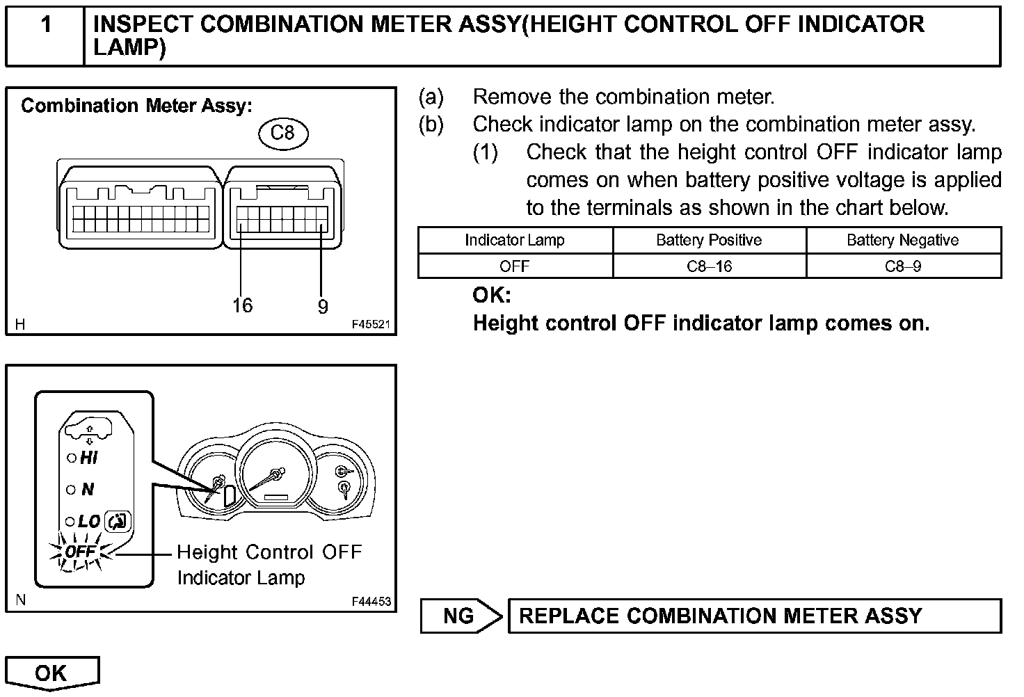If the suspension control ECU detects a problem, the height control OFF indicator lamp comes on while suspending the height control function at the same time. At this time, the suspension control ECU records a DTC. Connect terminal TC and CG of the DLC3 to make the height control OFF indicator lamp flash and output DTC.