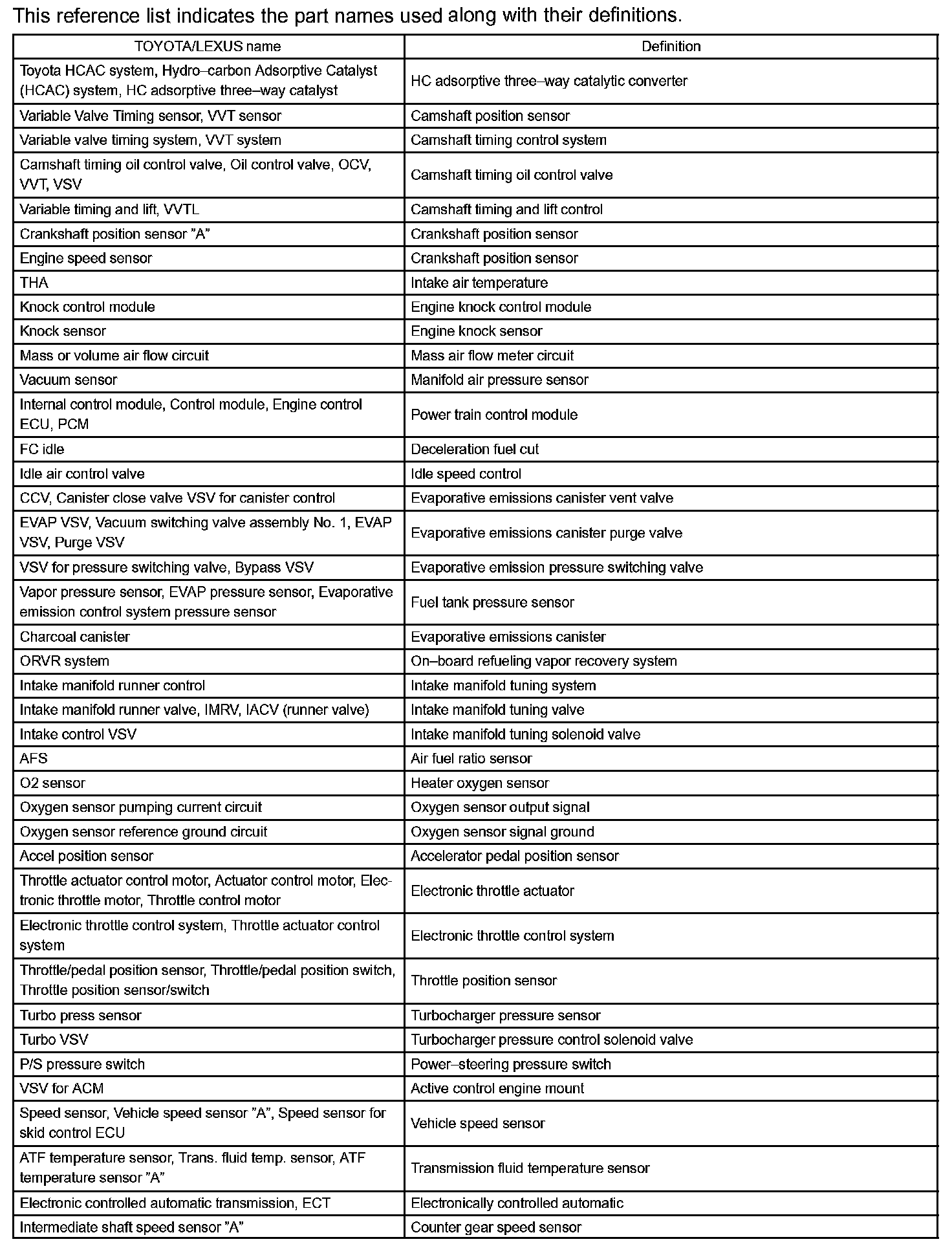 Lexus Part And System Name List Part 1: