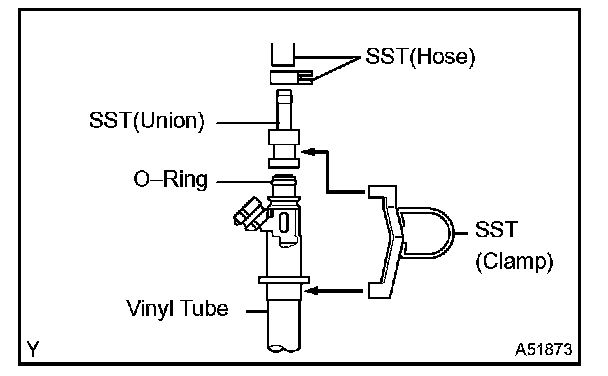 4. Connect SST (union and hose) to the injector, and hold the injector and the union with SST (clamp)