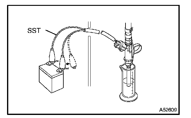 7. Connect SST (wire) to the injector and the battery for 15 seconds, and measure the injection volume with a graduated cylinder. Test each injector 2 or 3 times.