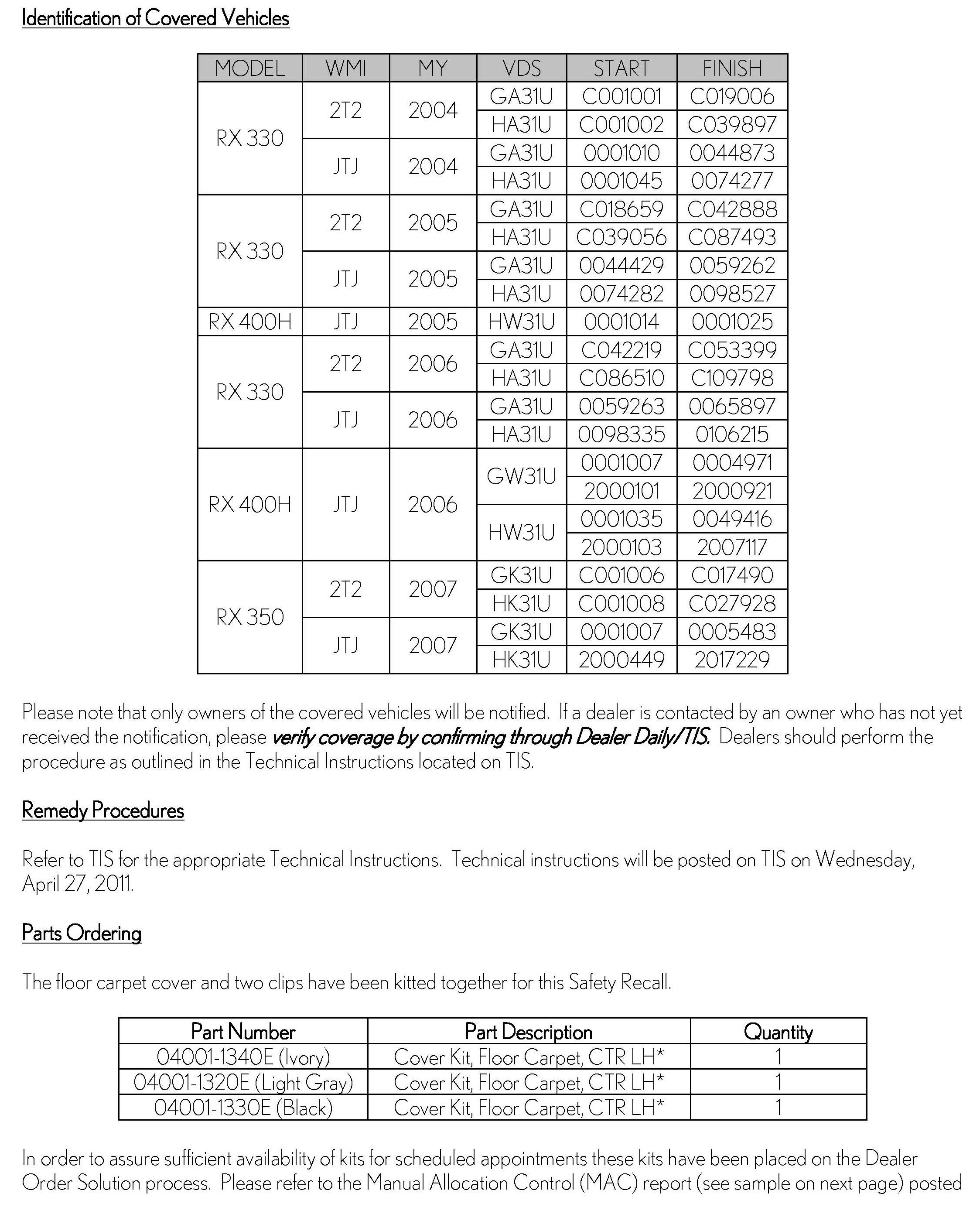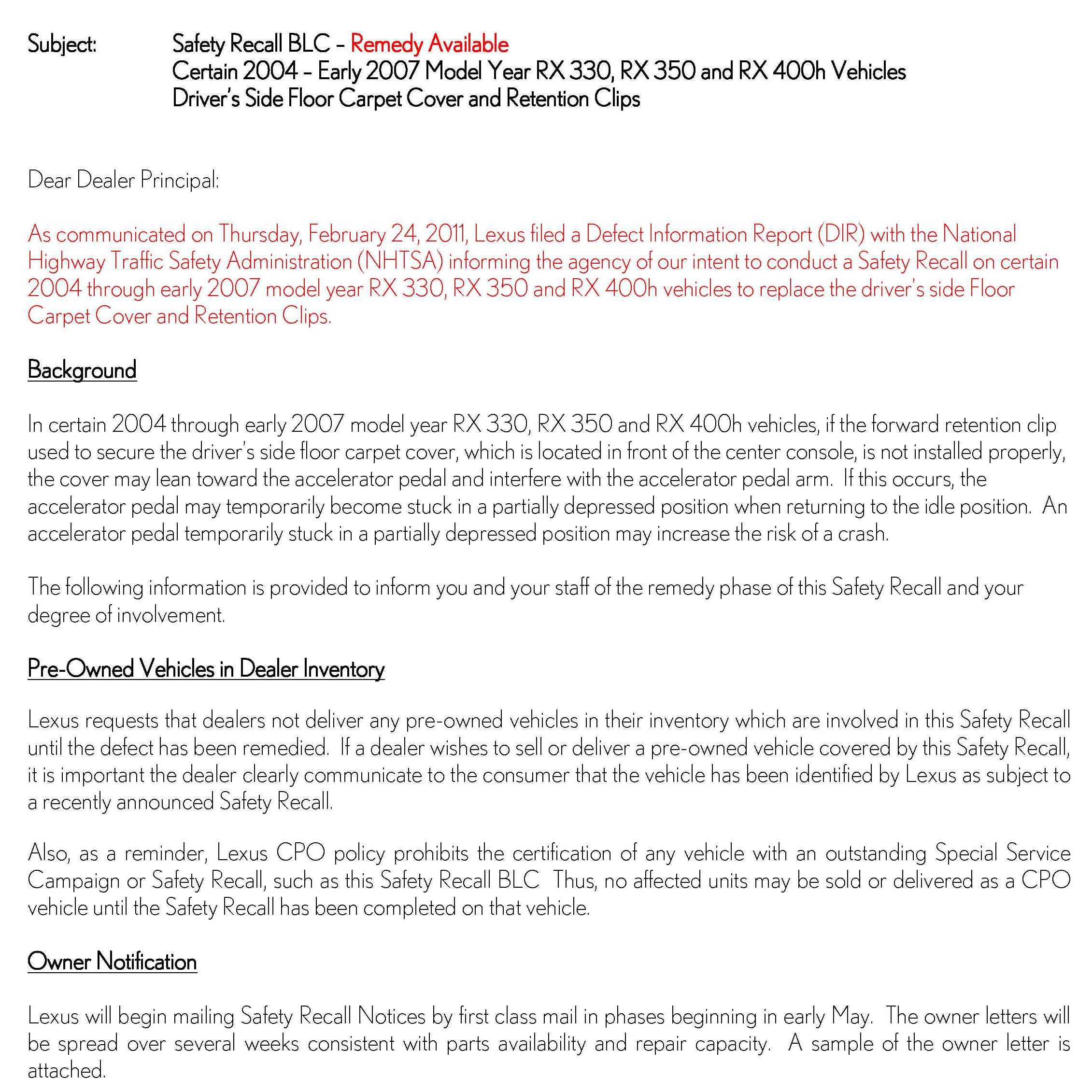 Recall - Accelerator Pedal/Carpet Interference