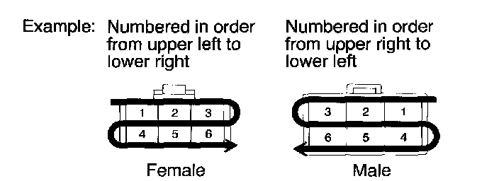 K: Indicates the pin number of the connector. The numbering system is different for female and male connectors.