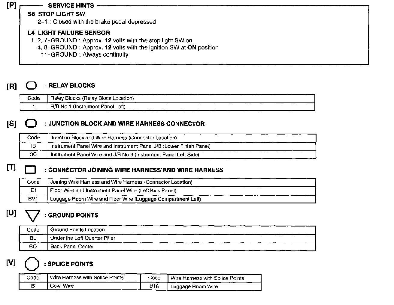 I: Indicates a wiring Splice Point (Codes are "E" for the Engine Room, "I" for the Instrument Panel, and "B" for the Body).