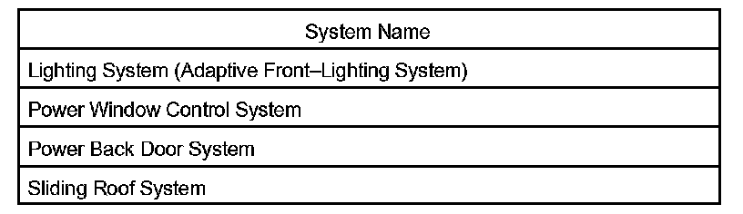 NOTE: When disconnecting the negative (-) battery terminal, initialize the systems shown in the table after the terminal is reconnected.