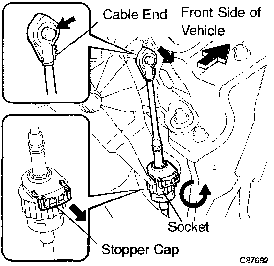 b. Turn the socket of the transmission control cable assembly counterclockwise and remove the stopper cap.