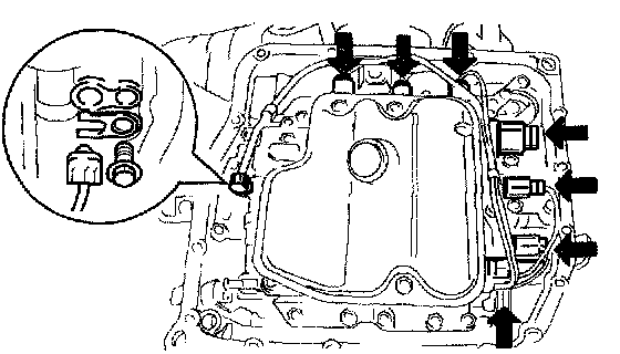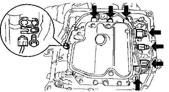 b. Install the 7 shift solenoid valves and 3 lock plates with the 5 bolts.