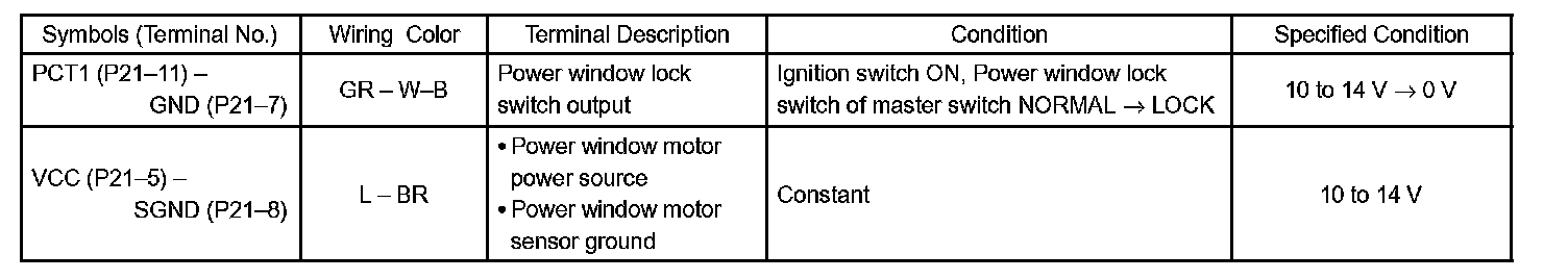 c. Reconnect the P21 switch connector and reset the power window motor (Refer to the pre check, step 16).