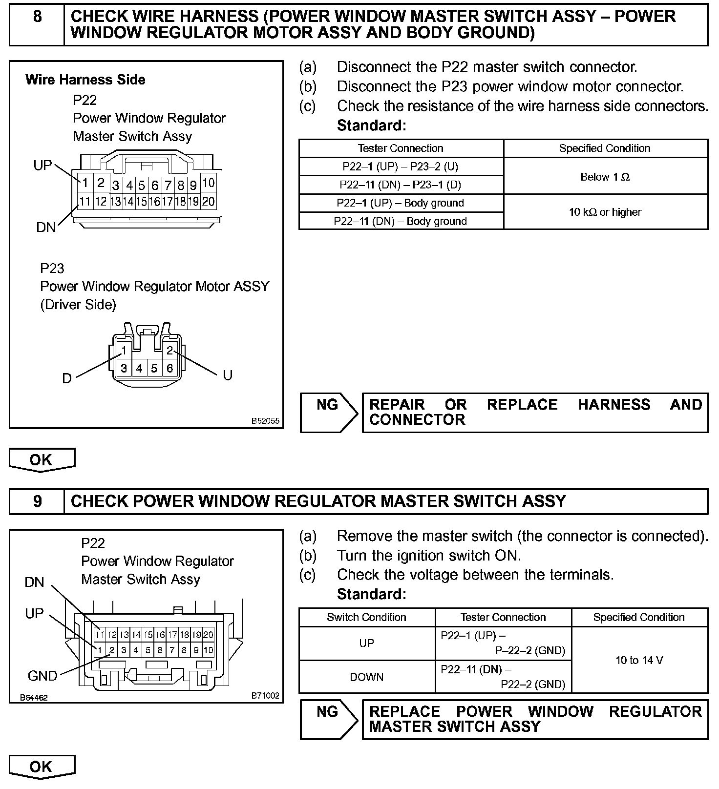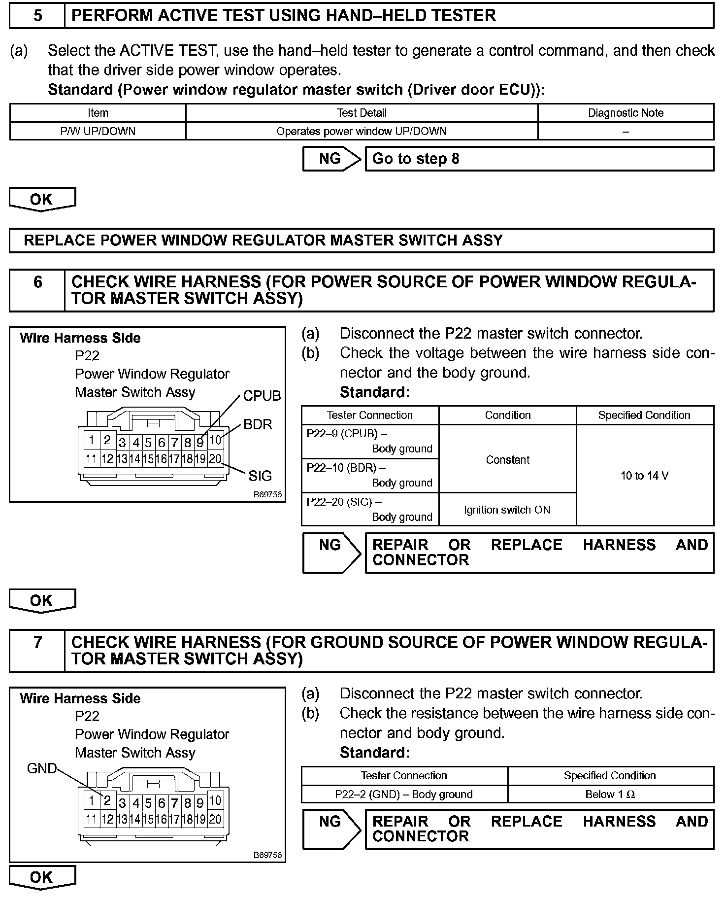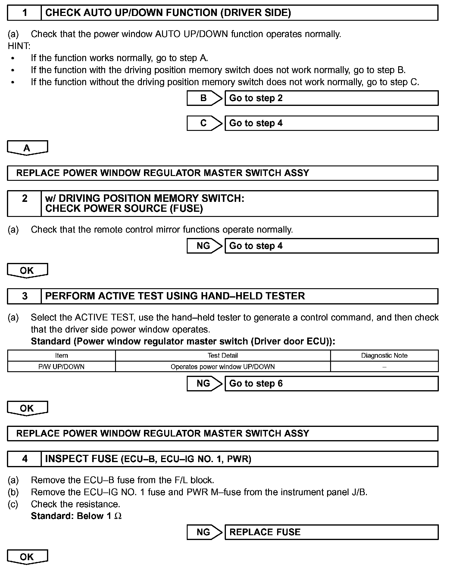 If the manual UP/DOWN function does not operate, the power window regulator motor, the power window regulator master switch or the wire harness may be malfunctioning.