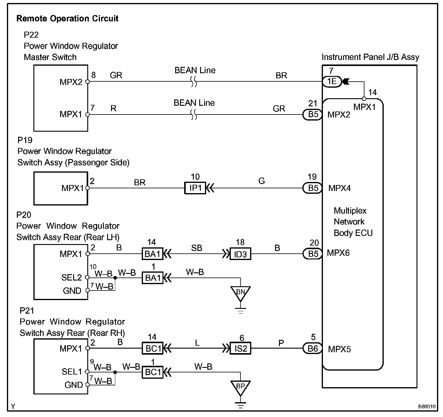 The power window master switch transmits a remote signal (using the BEAN line) to the multiplex network body ECU, which then transmits this remote signal (using the BEAN line) to the passenger side, rear-left and rear-right power window regulator switches respectively. Then, these power window regulator switches drive the applicable window motors.