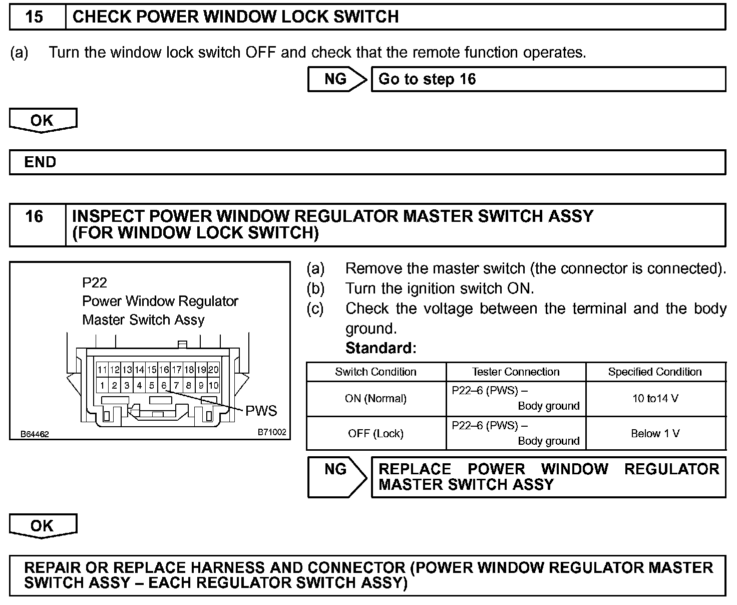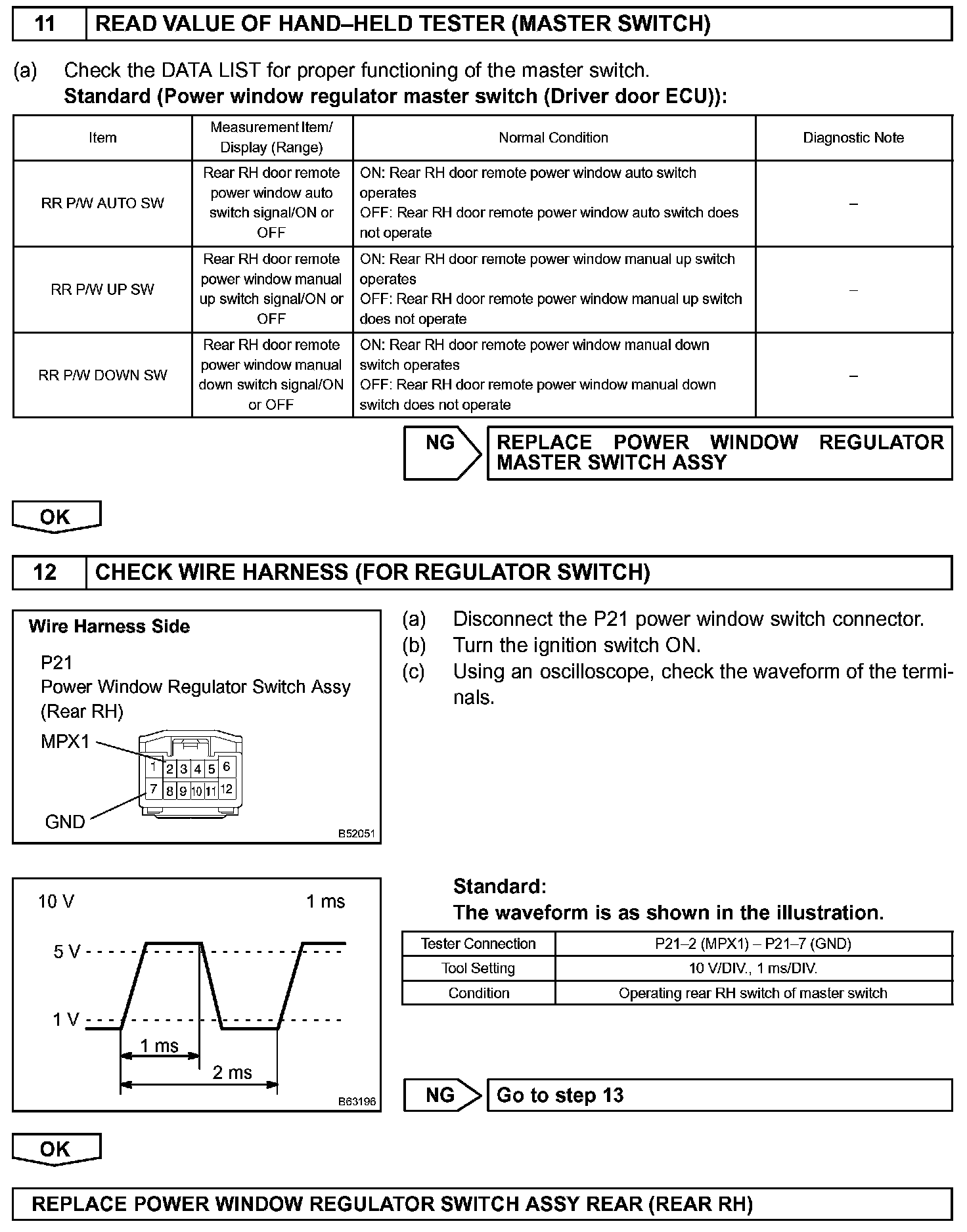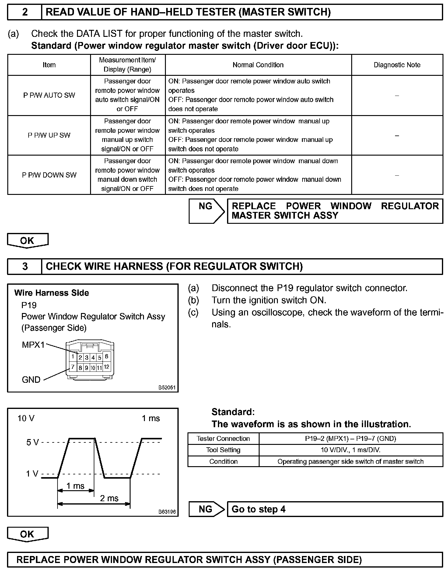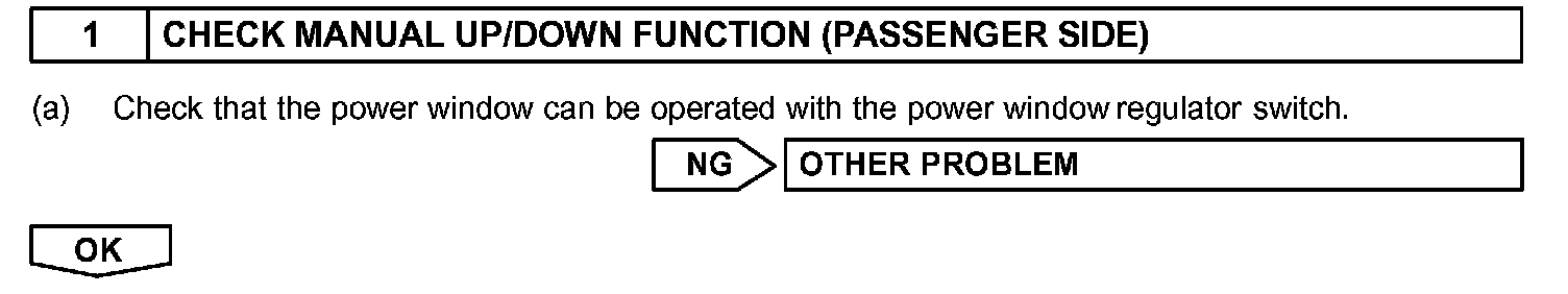 HINT: Check which power window cannot be operated, and then proceed with troubleshooting procedures for the applicable power window as shown in the table.