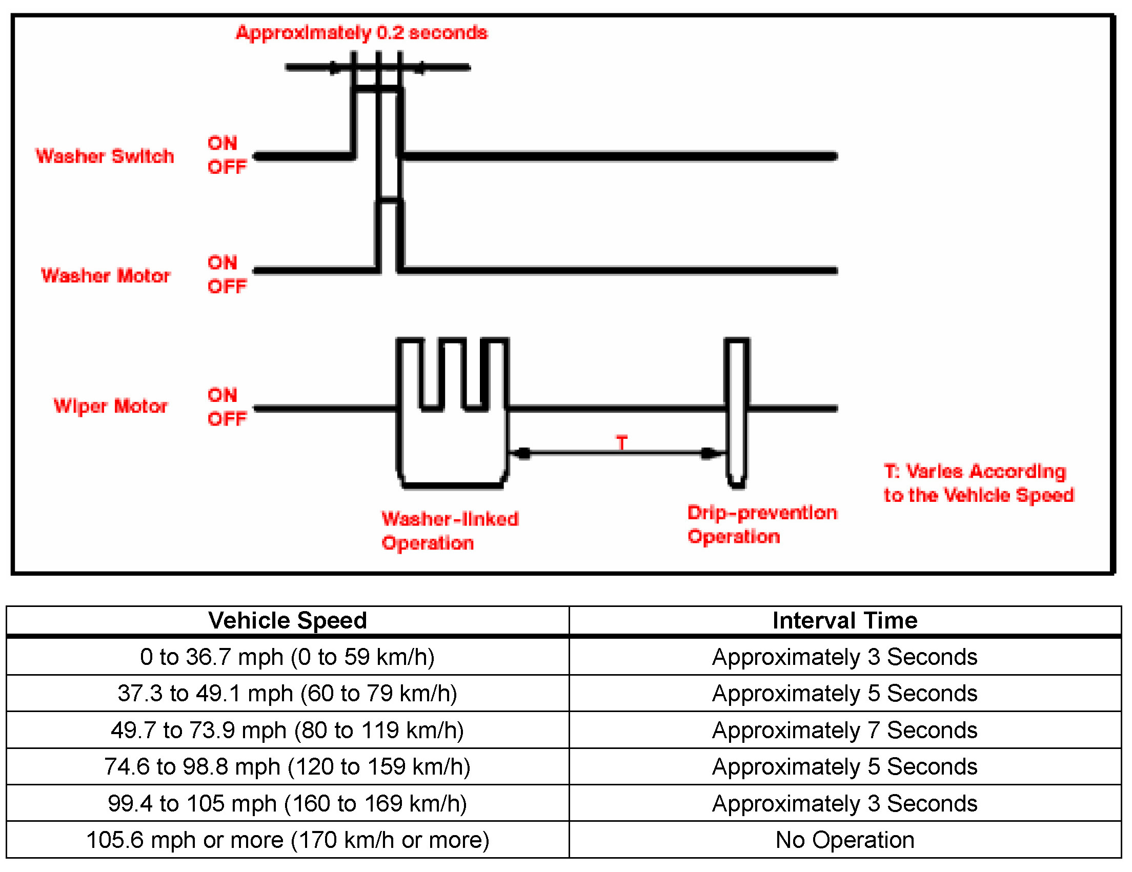 With this function, when the wiper switch is in the OFF or AUTO position, turning the washer switch ON for approximately 0.2 seconds or longer causes the washers to operate, and after the washer switch has been turned OFF, the wipers operate in unison 3 times at the low speed. Approximately 3 seconds (when the vehicle speed is between 0 to 36 mph [0 to 59 km/h]) after the low-speed operation of the wipers has been completed, the wipers operate once again to wipe off the washer fluid that has dripped. The drip prevention interval times are shown in the table according to the vehicle speed.