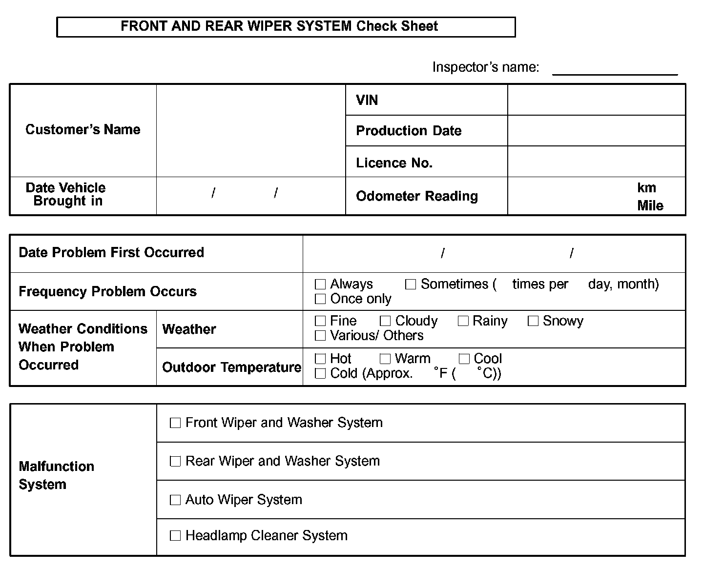 Front And Rear Wiper System Check Sheet: