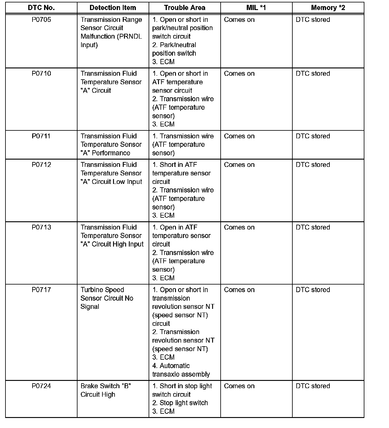 ^ *2: "DTC stored" mark means ECM memorizes the malfunction code if the ECM detects the DTC detection condition.