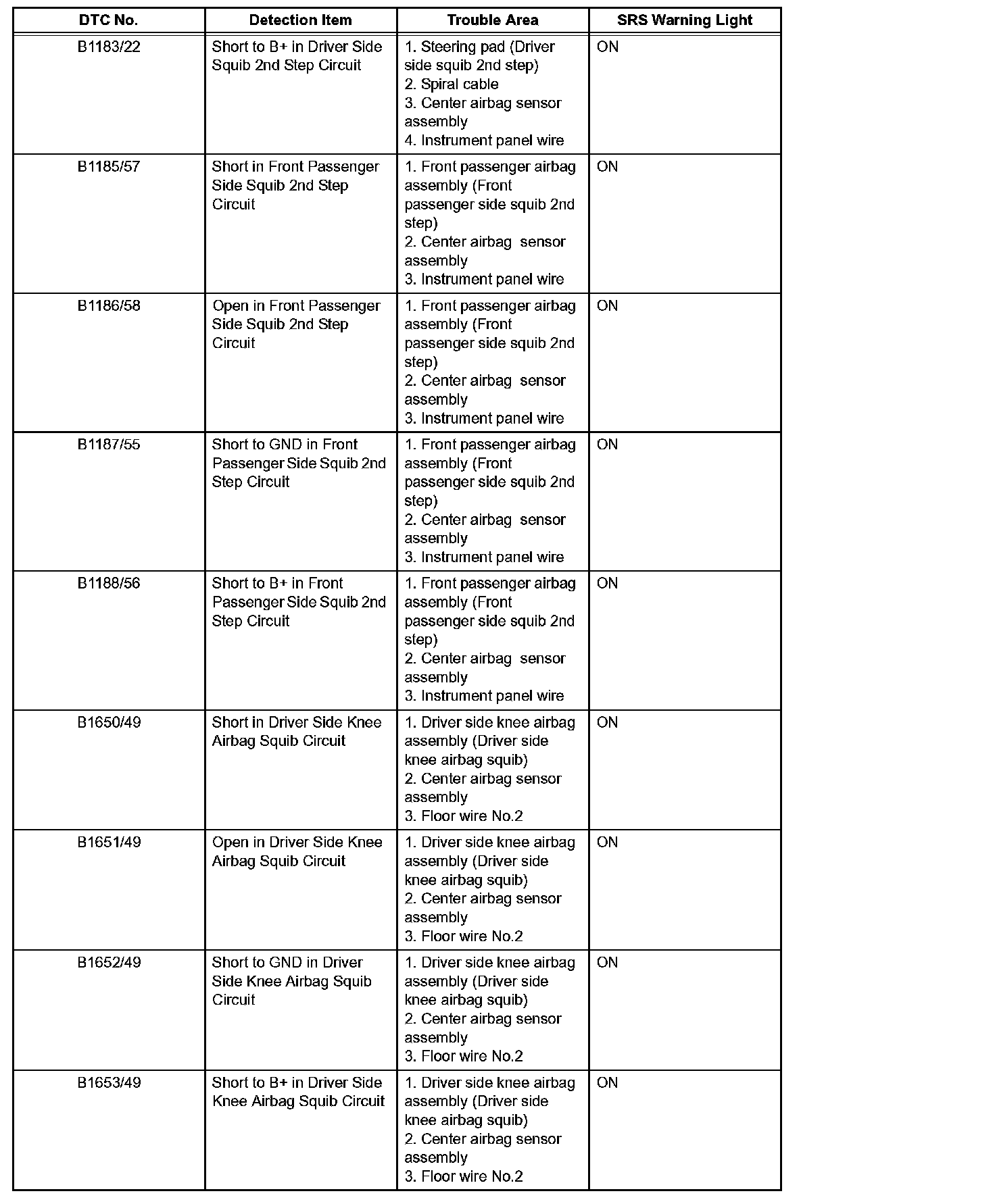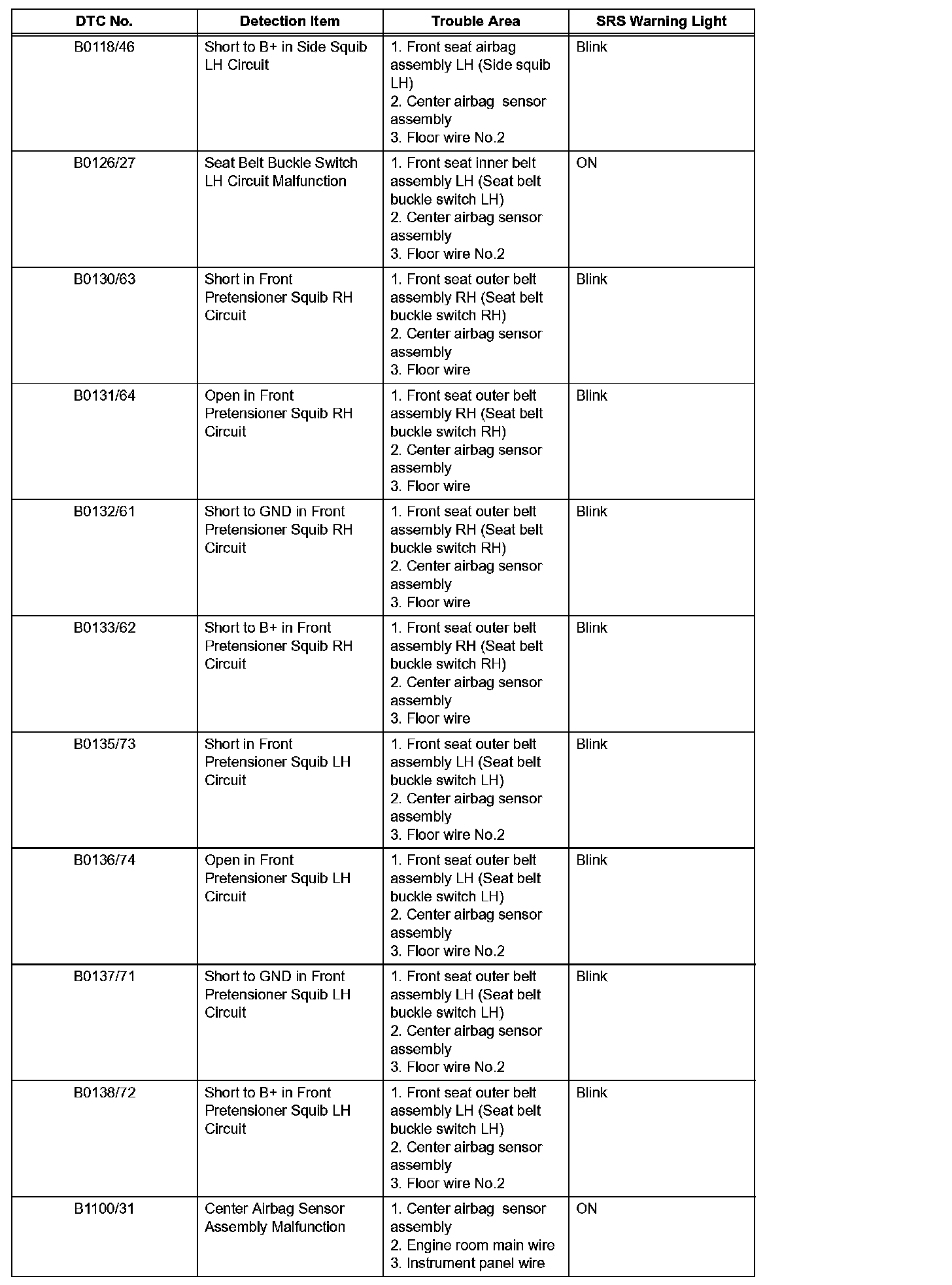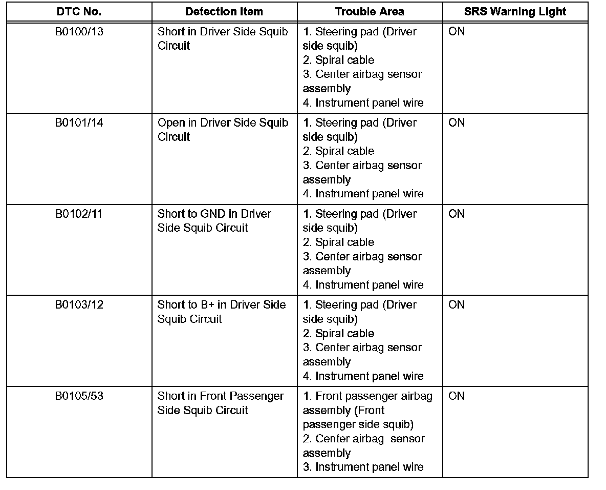 - In the case of any malfunction concerning an open circuit, short to ground, or short to B+ due to a squib, other trouble codes may not be detected.In this case, repair the malfunction currently indicated and then perform malfunction diagnosis again.