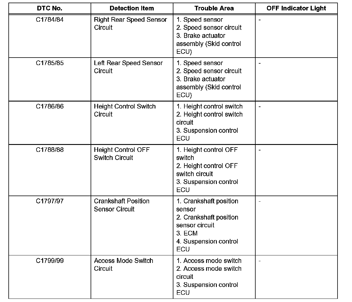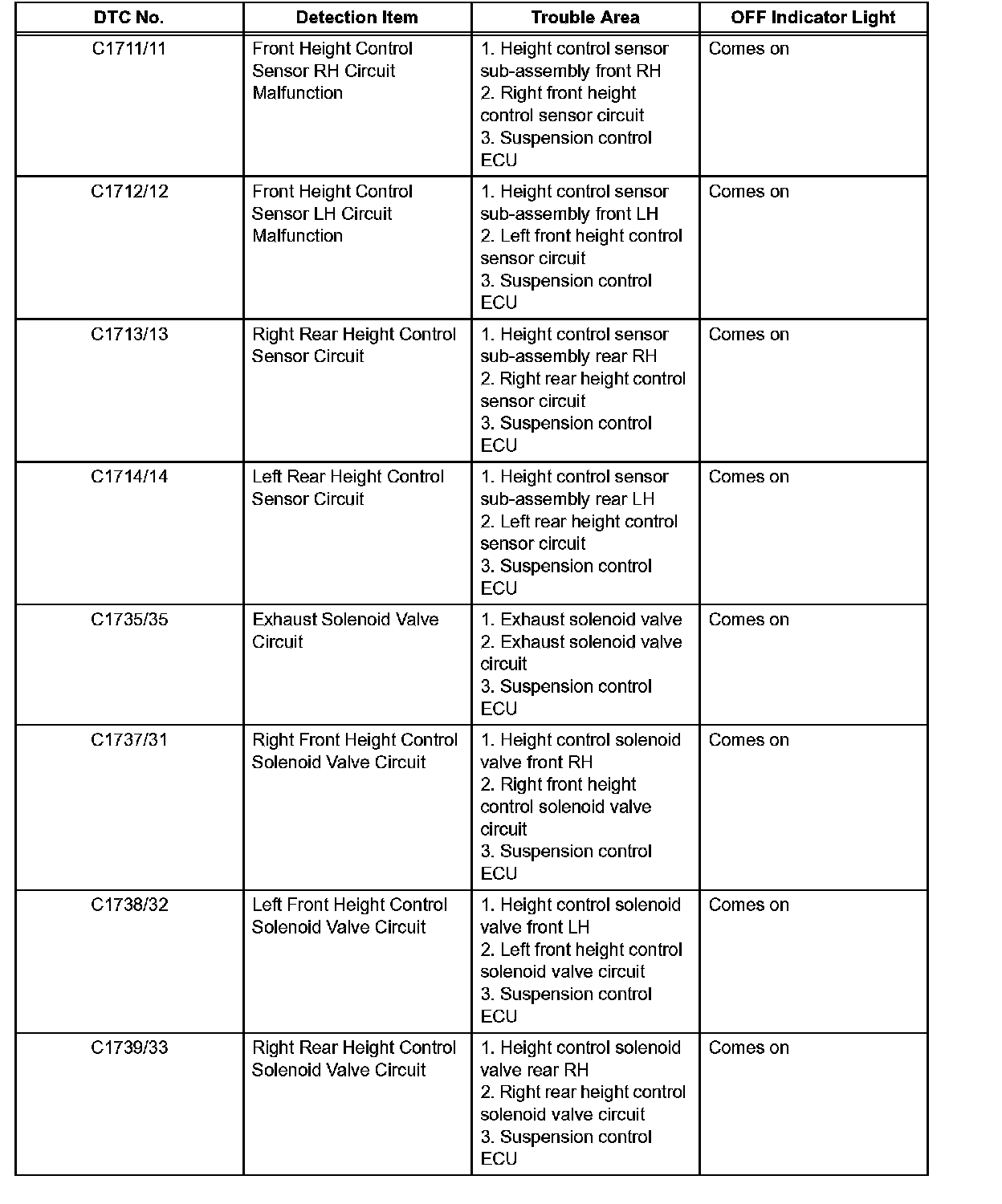 DTC Chart of Air Suspension System