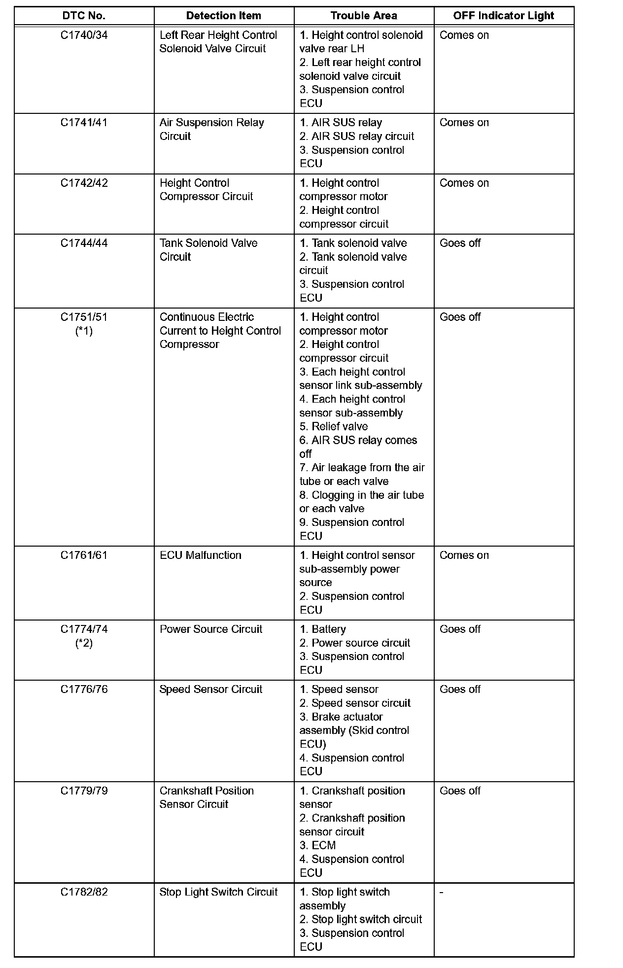 (*1): Code C1751/51 may be output, even through there is no trouble in the system, when the vehicle is fully loaded with passengers and luggage on a bumpy road or stopped, and the air tube freezes over.