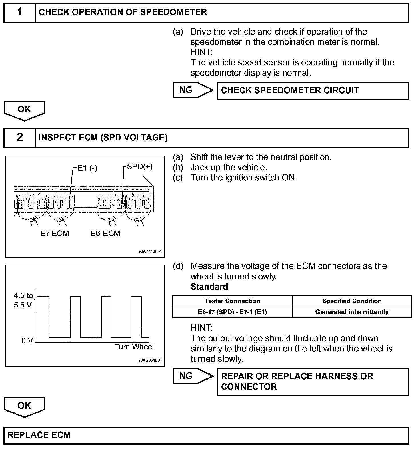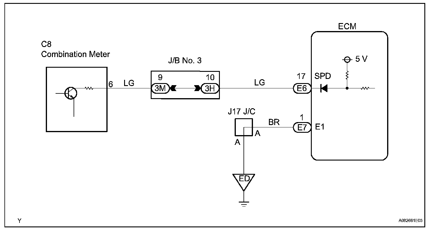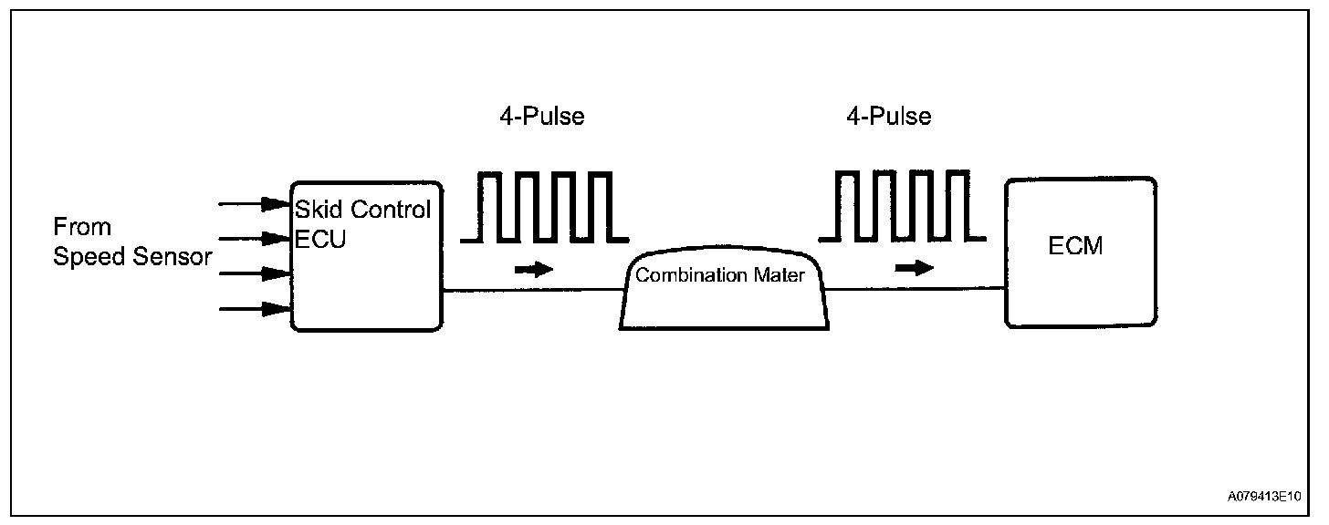 The speed sensor detects the wheel speed and sends the appropriate signals to the skid control ECU. The skid control ECU converts these wheel speed signals into a 4-pulse signal and outputs it to the ECM via the combination meter. The ECM determines the vehicle speed based on the frequency of these pulse signals.