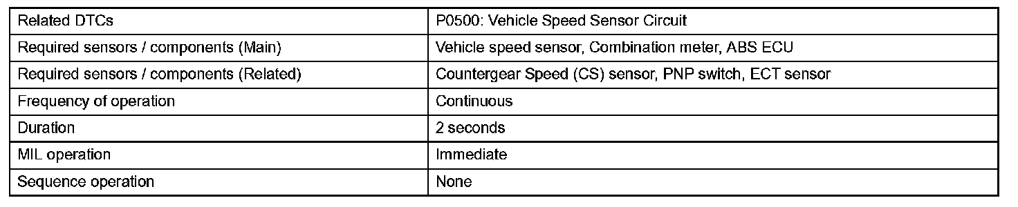 The ECM assumes that the vehicle is being driven when the transmission counter gear indicates more than 300 rpm and over 30 seconds have passed since the park/neutral position switch was turned OFF. If there is no signal from the vehicle speed sensor with these conditions satisfied, the ECM concludes that the vehicle speed sensor is malfunctioning. The ECM will turn on the MIL and a DTC will be set.